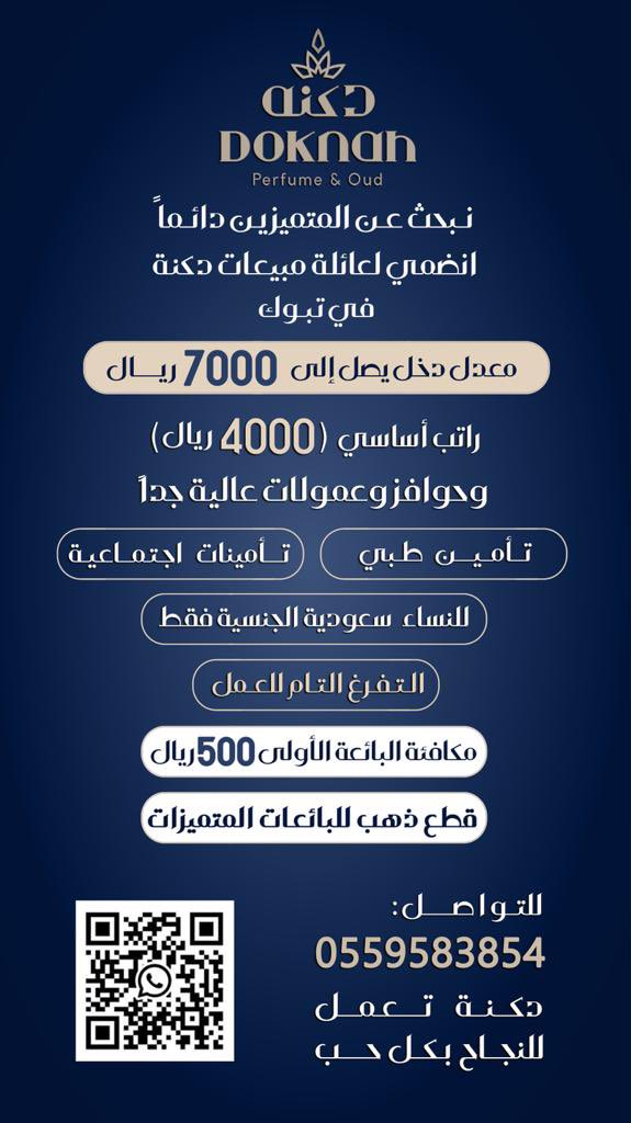 شركة دكنه للعطور (Doknah)، توفر وظائف شاغرة لحملة الثانوية العامة فما فوق للعمل بمجال المبيعات - بمدينة تبوك، وفقاً للتفاصيل التالية: