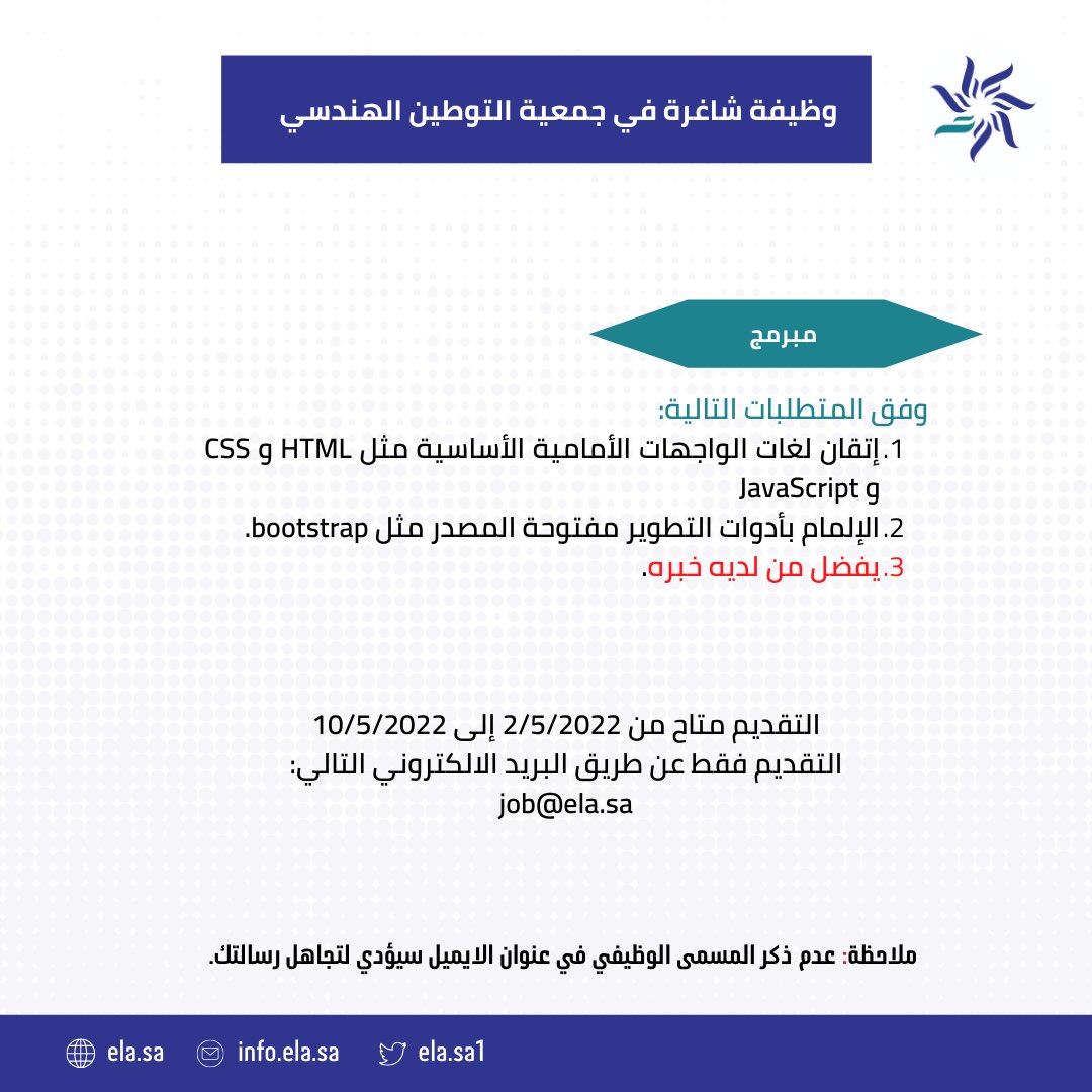 توفر وظائف تقنية شاغرة لحملة البكالوريوس فما فوق - للعمل بمجال البرمجة - بمقر الجمعية بمدينة الرياض - مع ملاحظة أن التقديم متاح للسعوديين فقط - وفقاً للتفاصيل التالية: