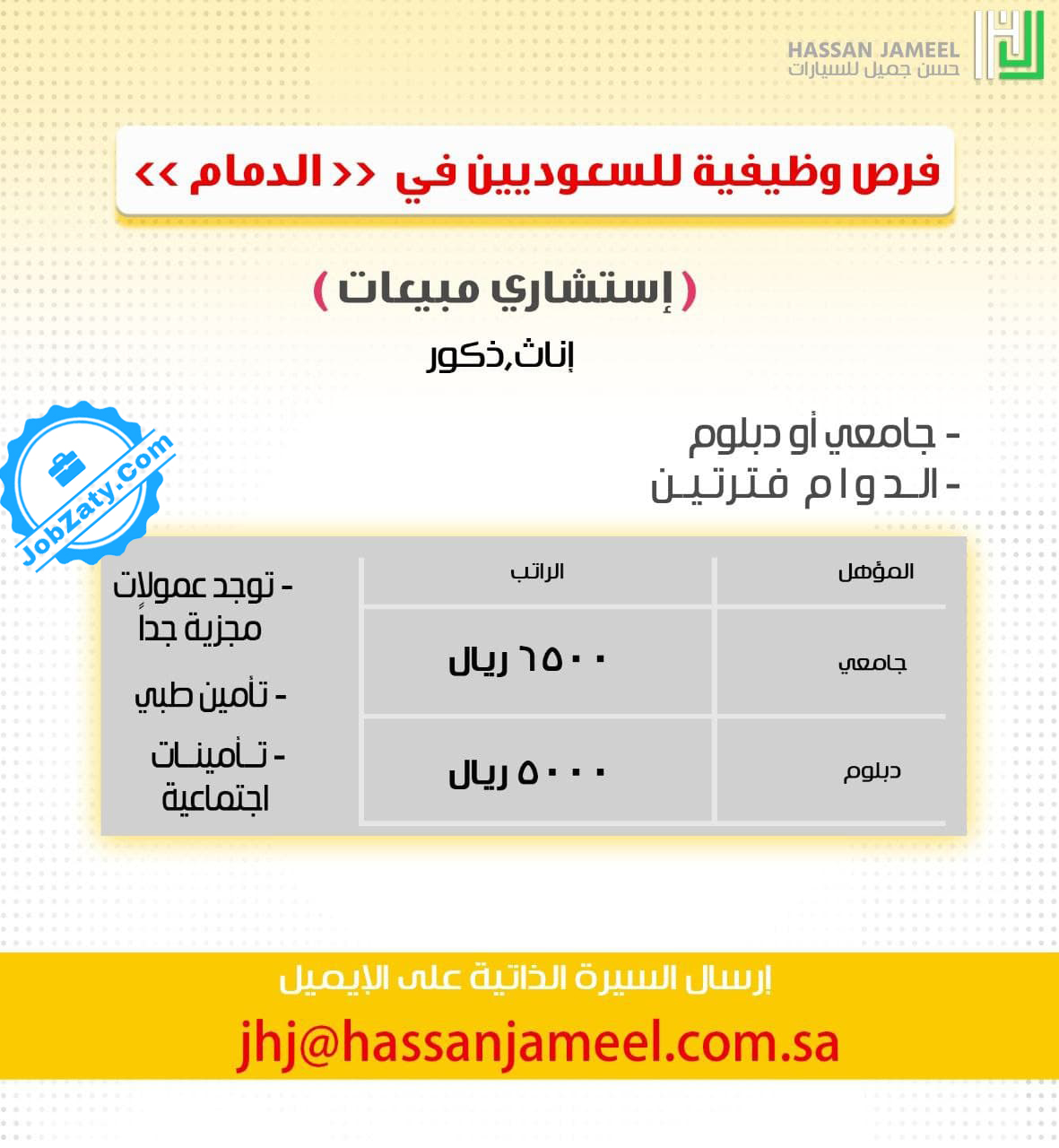 توفر وظائف إدارية لحملة الدبلوم فما فوق (رجال / نساء) للعمل بمجال المبيعات بمقر الشركة بالدمام - مع ملاحظة أن التقديم متاح للسعوديين فقط، وفقاً للتفاصيل التالية: