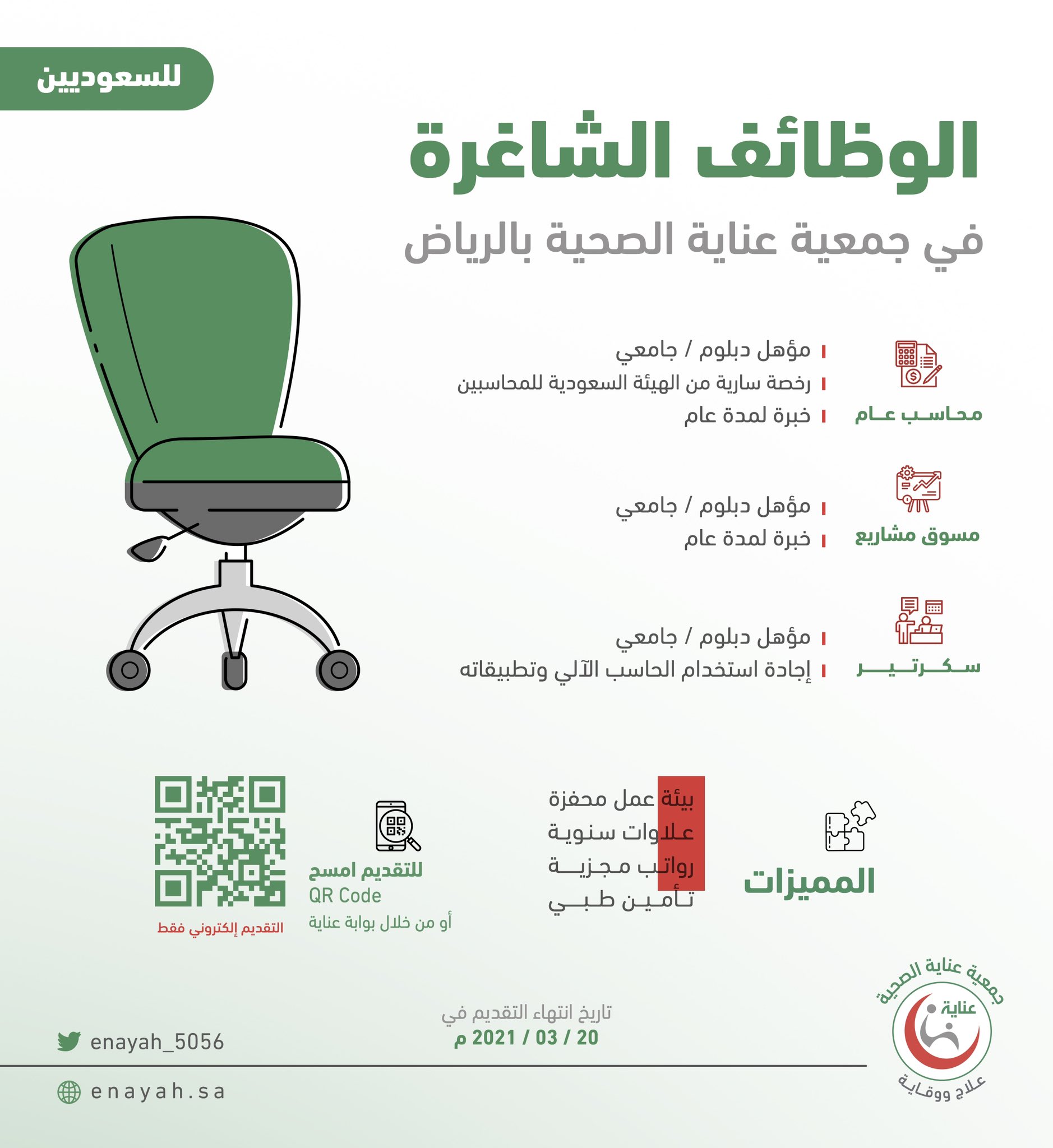 تعلن طرح وظائف إدارية شاغرة لحملة الدبلوم فما فوق للعمل بمقر الجمعية بمدينة الرياض - مع ملاحظة أن التقديم متاح للسعوديين فقط، وفقاً للتفاصيل التالية: