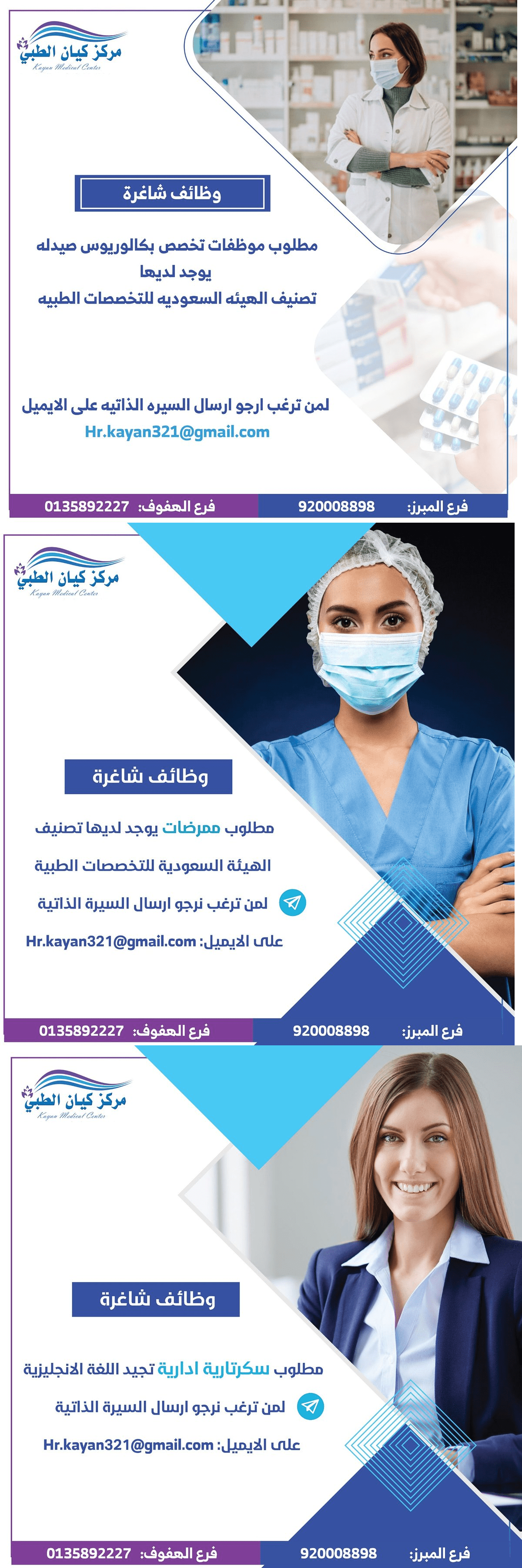 يوفر وظائف شاغرة بعدة مجالات إدارية وصحية، مع ملاحظة أن أفضلية التقديم للسعوديين، وفقاً للتفاصيل التالية: