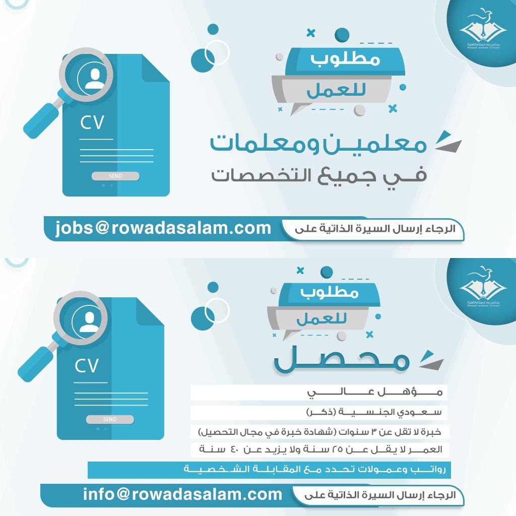 مدارس رواد السلام الأهلية تعلن عن توفر وظائف تعليمية ومالية لحملة البكالوريوس فما فوق (رجال / نساء) لجميع التخصصات التعليمية، للعمل بمقر المدرسة بمدينة الدمام، مع ملاحظة أن أفضلية التوظيف للسعوديين، وفقاً للتفاصيل التالية: