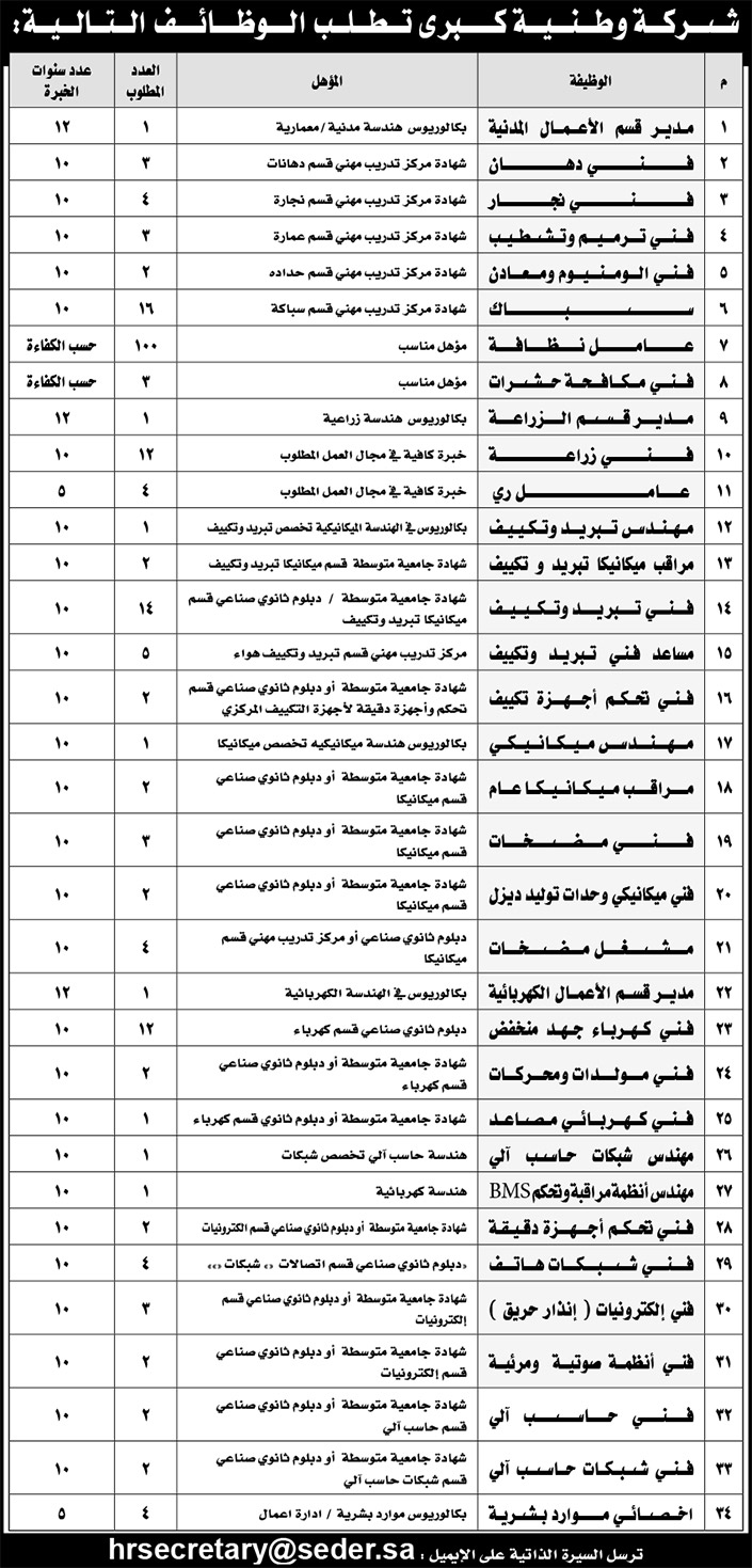 تعلن طرح أكثر من (200) وظيفة شاغرة في مجالات (إدارية، فنية، هندسية، عمالية) لحملة مختلف المؤهلات (الكفاءة، الثانوية، الدبلوم، البكالوريوس)، وفقاً للتفاصيل التالية: