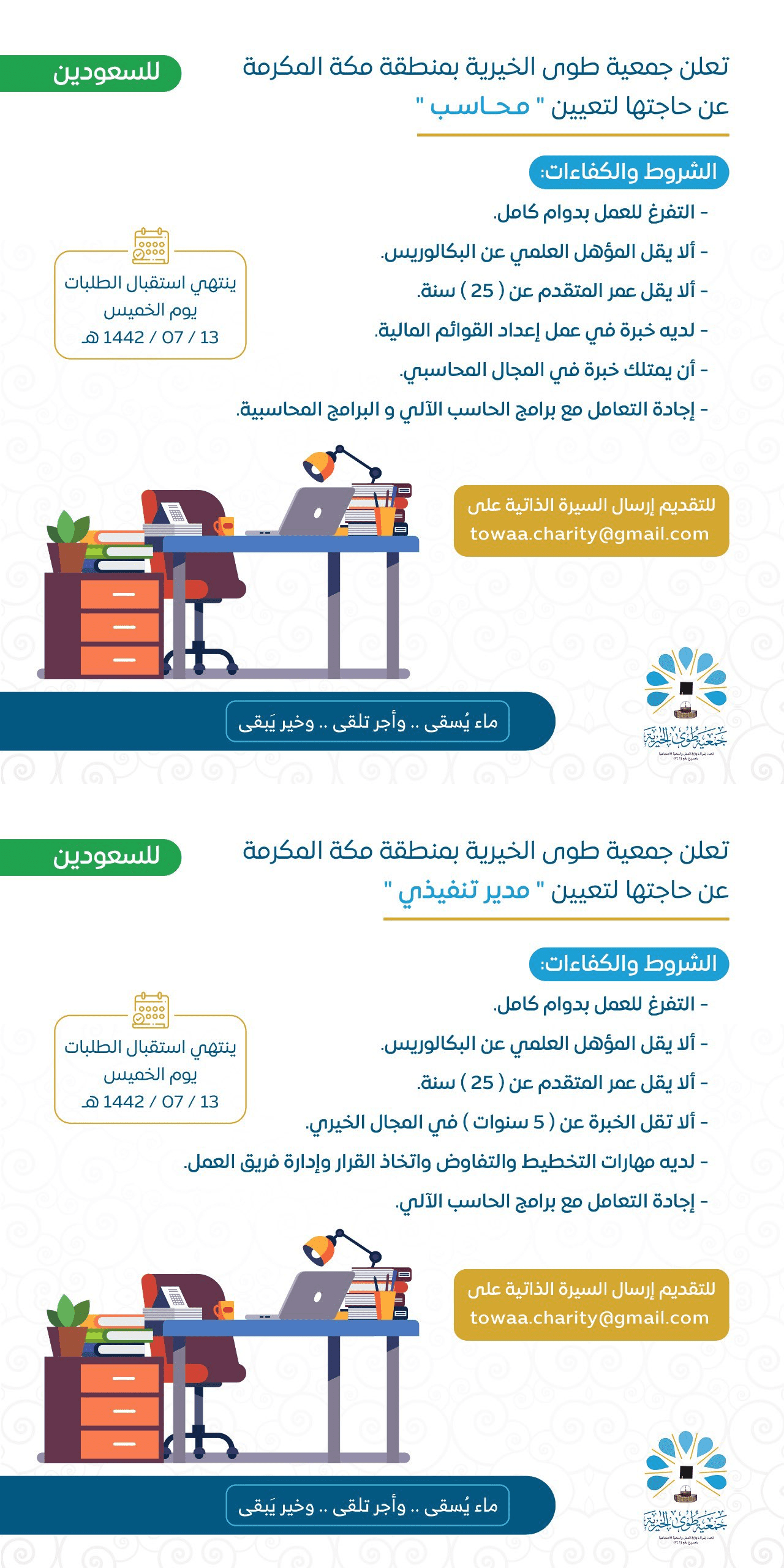 توفر وظائف إدارية شاغرة لحملة البكالوريوس في عدة تخصصات؛ للعمل بمقر الجمعية بمدينة مكة المكرمة، مع ملاحظة أن التقديم متاح للسعوديات فقط، وفقاً للتفاصيل التالية: