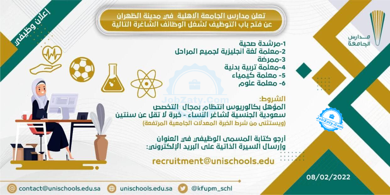 تعلن فتح باب التوظيف لشغل الوظائف الشاغرة في عدة مجالات (تعليمية وصحية)، بمقر المدرسة بـ الظهران - مع ملاحظة أن التقديم متاح للسعوديين فقط، وفقاً للتفاصيل التالية: