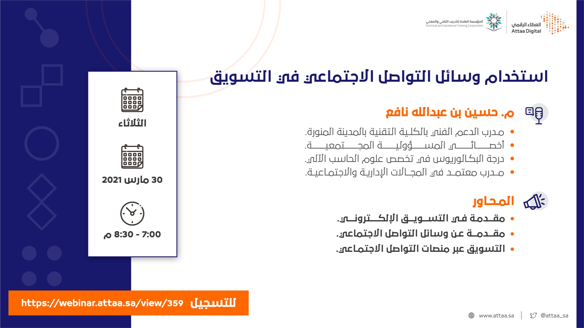 أعلنت مبادرة العطاء الرقمي (مبادرة تخصصية غير ربحية برعاية وزارة الإتصالات وتقنية المعلومات) عن تقديم دورة تدريبية مجانية (عن بُعد) بشهادة حضور معتمدة -  بمجال التسويق باستخدام وسائل التواصل الاجتماعي، وذلك وفقاً للتفاصيل التالية: