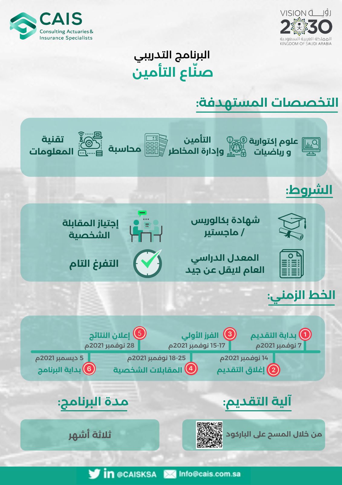 أعلنت شركة المتحدون للخدمات الاكتوارية، بدء التقديم في البرنامج التدريبي (صنّاع التأمين - الدفعة التاسعة)، والذي يستهدف خريجي وخريجات البكالوريوس والماجستير في عدة تخصصات، بهدف تنمية الموارد البشرية الوطنية المتخصصة، مع العديد من المزايا، وذلك وفقاً للتفاصيل التالية: