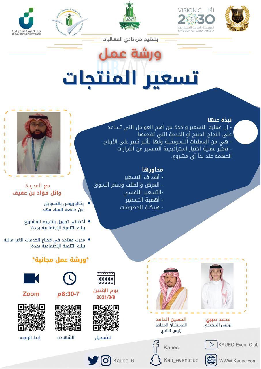 جامعة الملك عبدالعزيز بالتعاون مع بنك التنمية الإجتماعية تعلن عن تقديم دورة تدريبية مجانية بعنوان: "تسعير المنتجات" والتي تستهدف كافة فئات المجتمع من الرجال والنساء - مع منح المتدربين شهادات حضور - وذلك وفقاً للتفاصيل التالية: