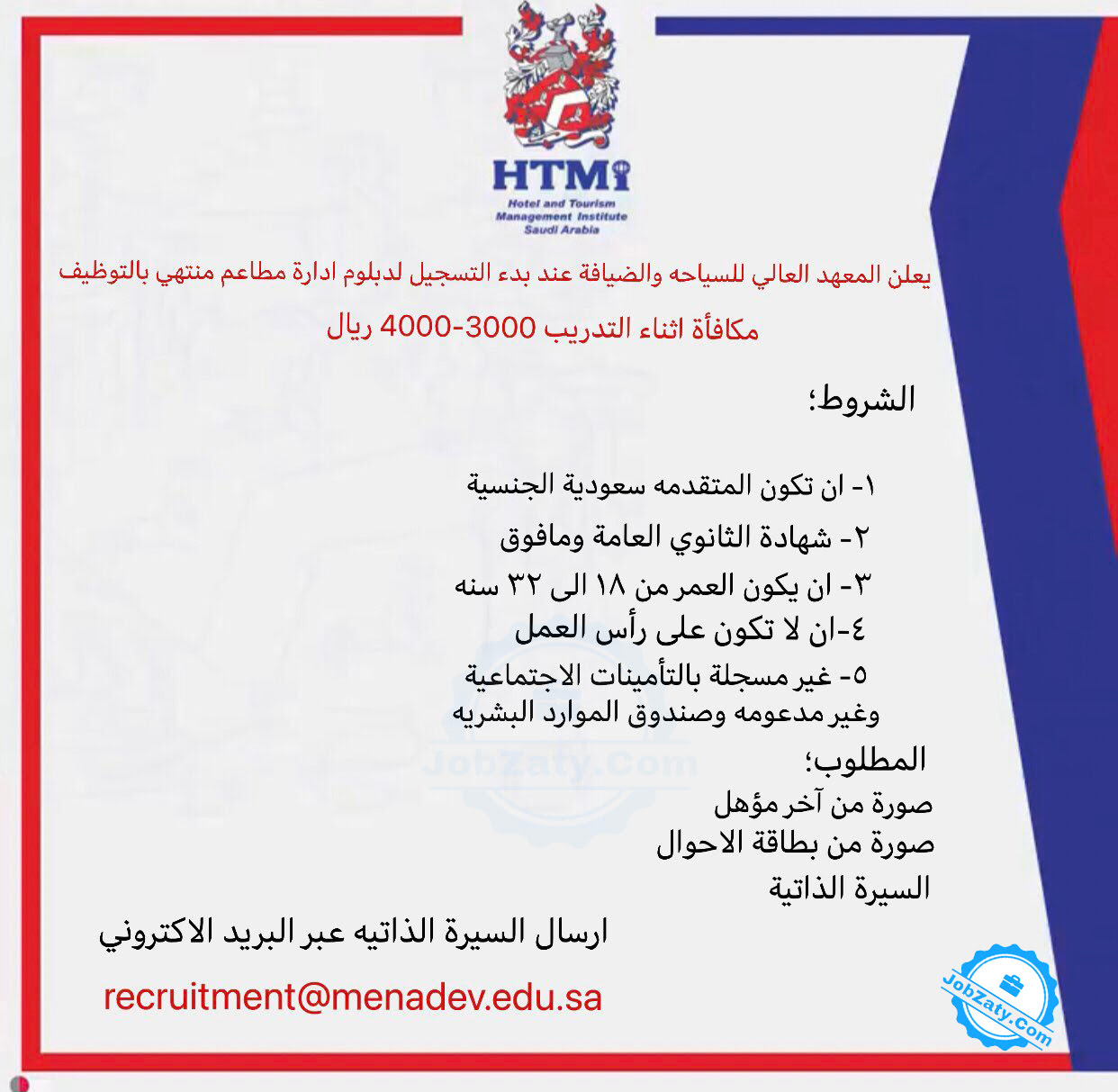 يُعلن المعهد العالي للسياحة بالتعاون مع صندوق تنمية الموارد البشرية (هدف)؛ عن بدء التسجيل في دبلوم إدارة المطاعم (المنتهي بالتوظيف) والذي يستهدف حملة الثانوية فما فوق، مع مكافاة شهرية أثناء التدريب وشهادة معتمدة من المؤسسة العامة للتدريب التقني والمهني بعد الانتهاء، وفقاً للتفاصيل والشروط التالية:
