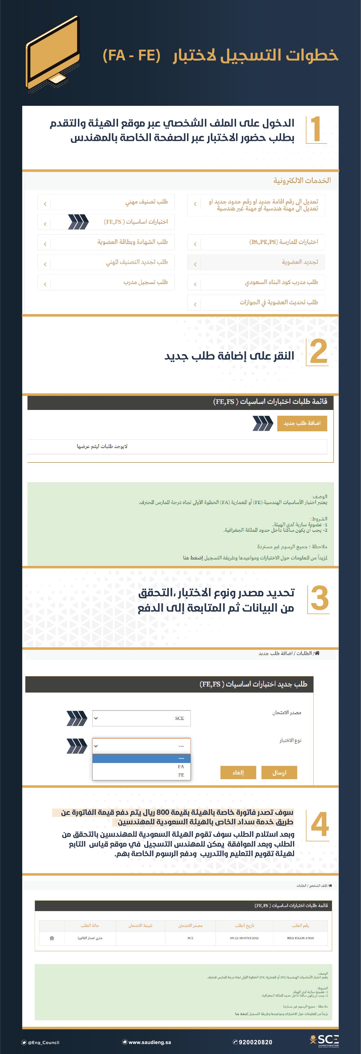 الهيئة السعودية للمهندسين تعلن عن فتح باب التسجيل في الاختبارات المهنية FE وFA للفترة الأولى والتي تقام بمراكز (قياس) وستكون بشكل محوسب - وذلك وفقاً للتفاصيل التالية: