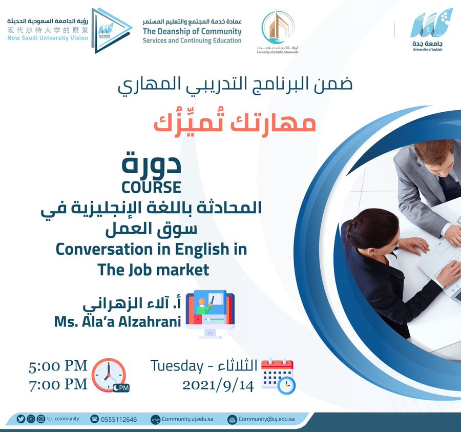 جامعة جدة تعلن عن تقديم دورة تدريبية مجانية (عن بعد) بعنوان (المحادثة باللغة الإنجليزية في سوق العمل) تستهدف كافة فئات المجتمع من الرجال والنساء، وذلك ضمن البرنامج التدريبي المهاري (مهاراتك تُميزك) لعام 2021م، والذي يهدف إلى تأهيل وتدريب الطلاب والخريجين والباحثين عن عمل وصقل مهاراتهم التي تؤهلهم للنجاح وبناء شراكات مستقبلية، وإعدادهم لسوق العمل - مع منح المتدربين شهادات معتمدة (برسوم رمزية)، وذلك وفقاً للتفاصيل التالية: