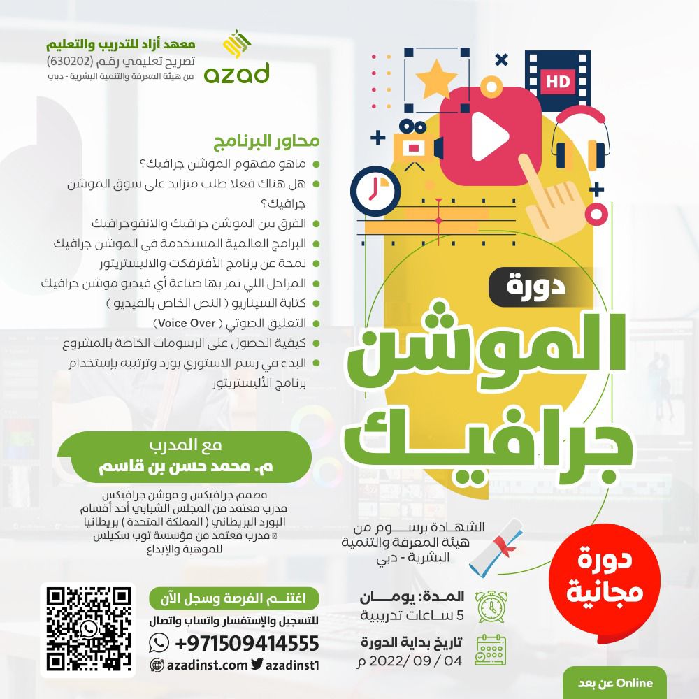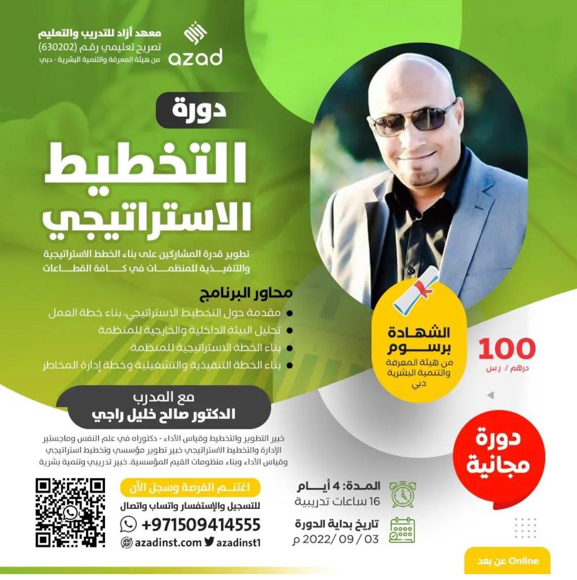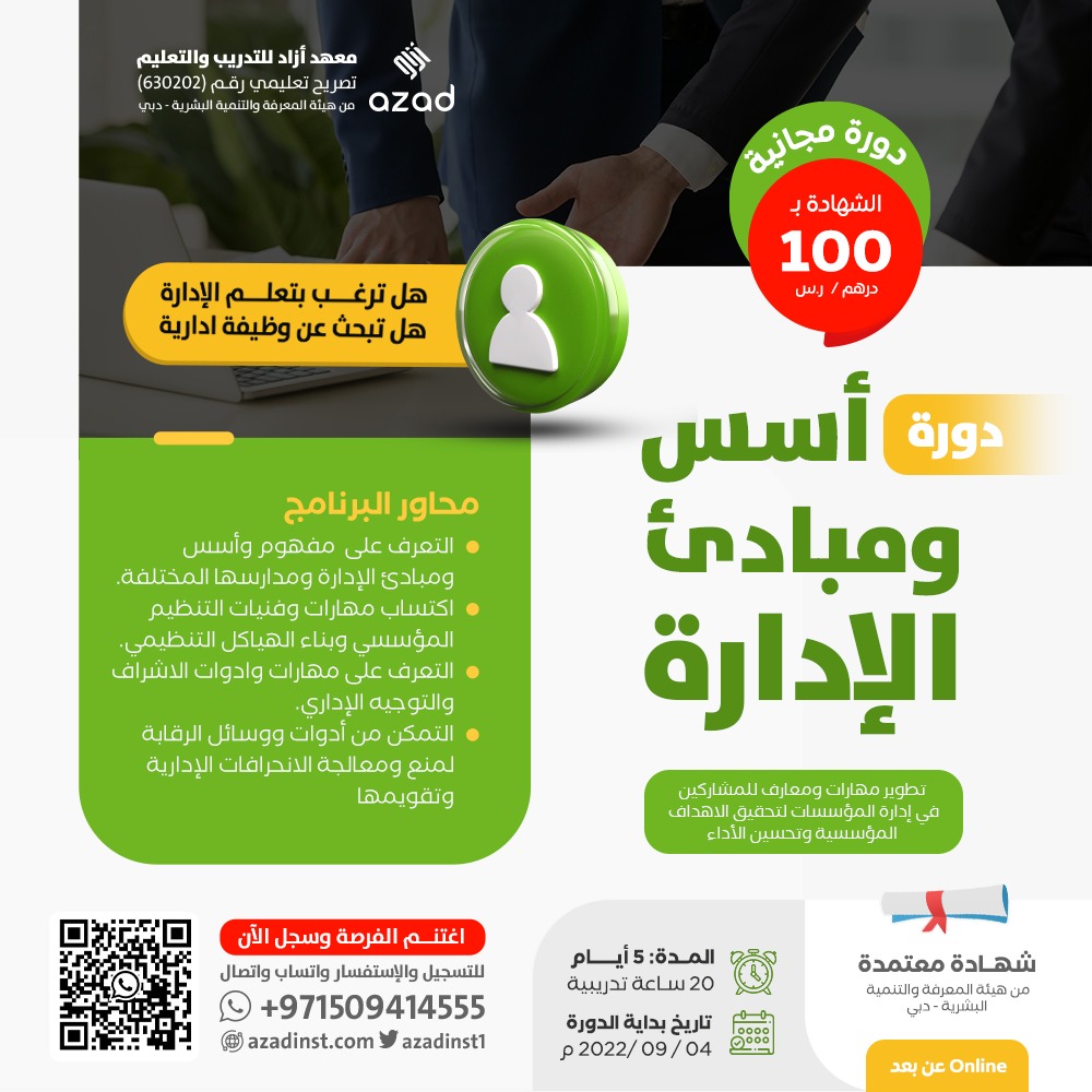 أعلن معهد أزاد للتدريب والتعليم تقديم عدة دورات تدريبية (الحضور مجانا) مع شهادة حضور معتمدة برسوم رمزية، تستهدف الدورات كافة فئات المجتمع (رجال/نساء) بهدف تمكين الشباب للمساهمة بشكل أكبر في عملية التنمية البشرية بما يتماشى مع رؤية المملكة 2030م، وذلك وفقا للتفاصيل التالية: