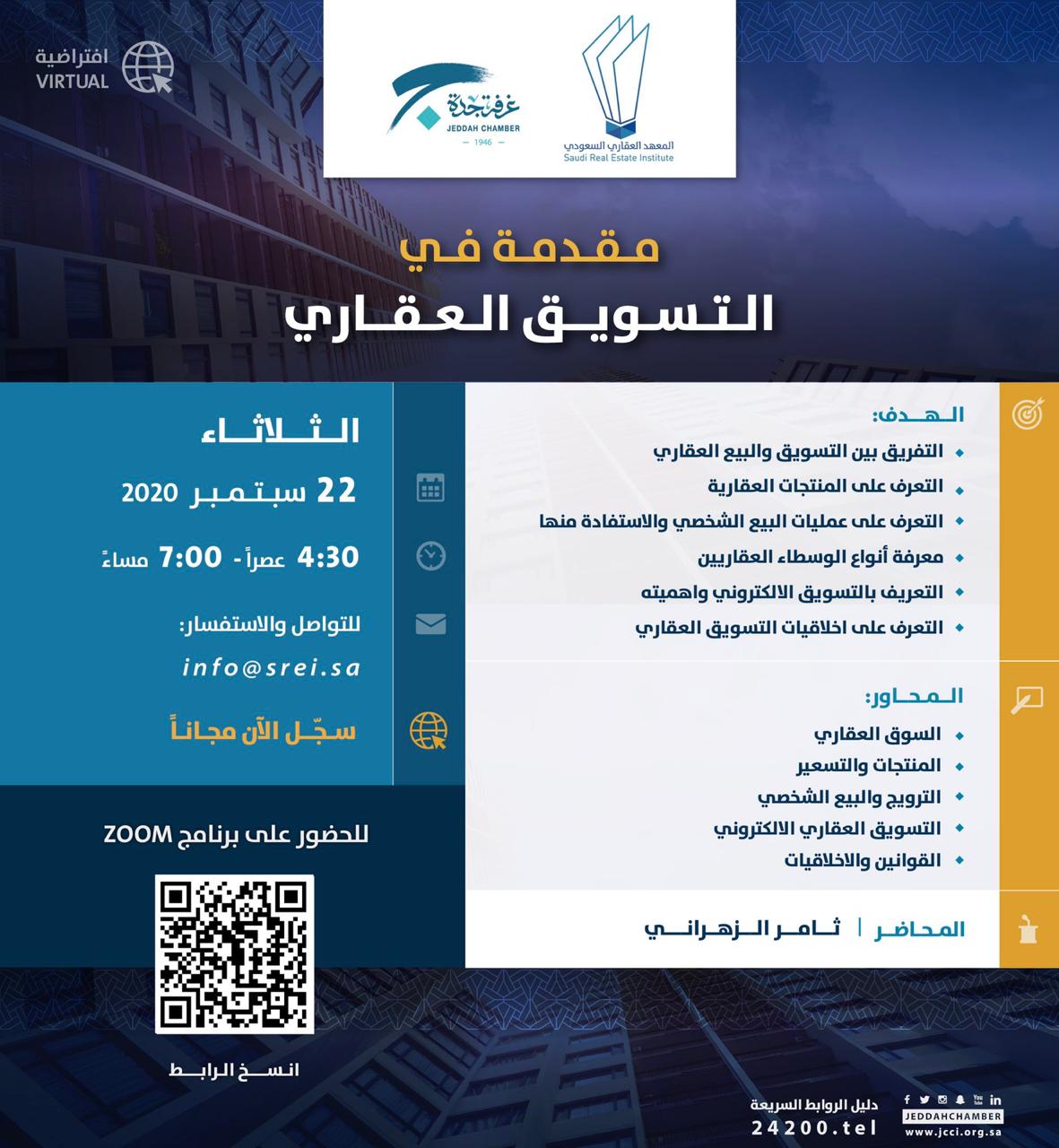 أعلنت غرفة جدة بالتعاون مع المعهد العقاري السعودي، عن تقديم "دورة مجانية" في مجال التسويق العقاري، وذلك عبر برنامج ZOOM، وتستهدف الدورة كافة فئات المجتمع المهتمين بالتسويق والإستثمار العقاري، وذلك وفقاً للتفاصيل التالية: