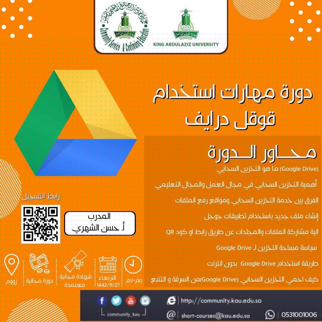 جامعة الملك عبدالعزيز، تعلن عن تقديم دورة تدريبية مجانية بعنوان: "مهارات استخدام جوجل درايف"، تستهدف كافة فئات المجتمع من الرجال والنساء - مع منح المتدربين شهادات معتمدة - وذلك وفقاً للتفاصيل التالية: