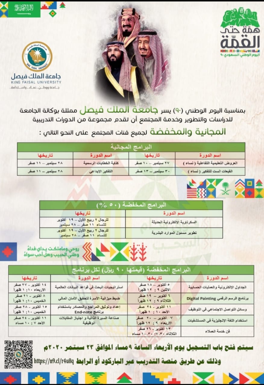 جامعة الملك فيصل تقدم مجموعة من الدورات المجانية والمخفضة بمناسبة اليوم الوطني