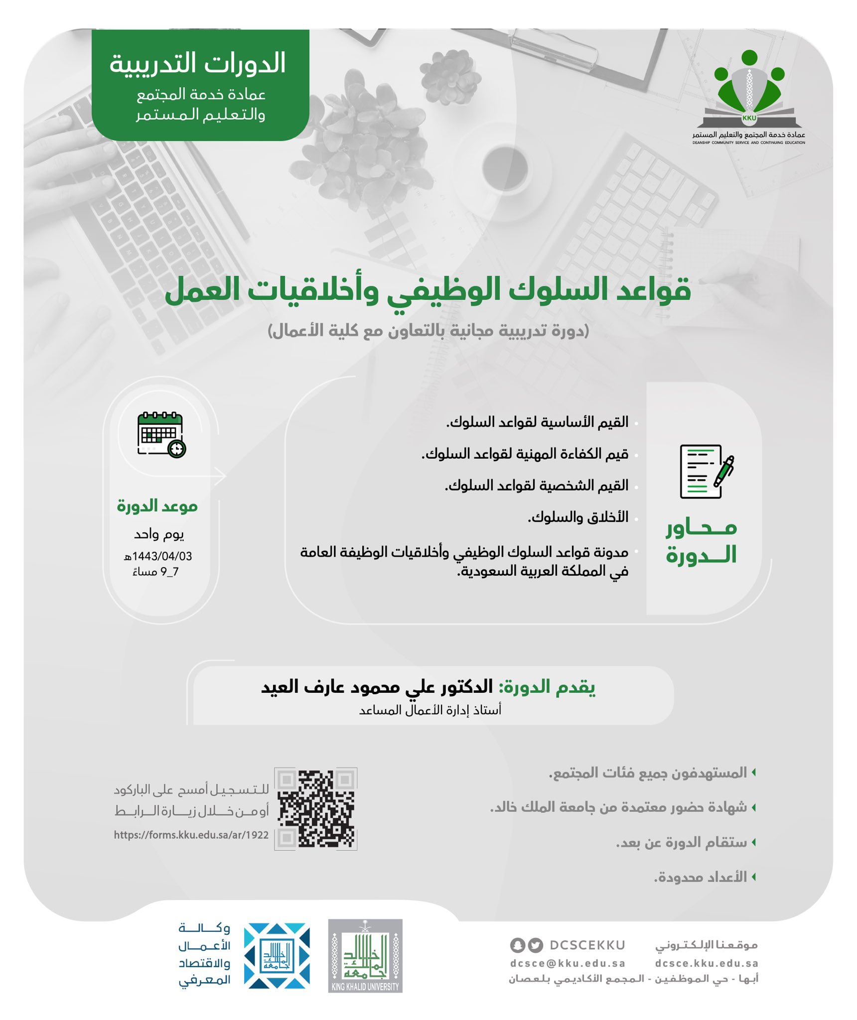 جامعة الملك خالد (عمادة خدمة المجتمع والتعليم المستمر) تعلن عن تقديم دورة تدريبية مجانية في مجال (السلوك الوظيفي وأخلاقيات العمل)، بالتعاون مع كلية الأعمال، مع منح المتدربين شهادات حضور معتمدة من الجامعة، وتستهدف الدورة كافة فئات المجتمع من الجنسين - وفقاً للتفاصيل التالية: