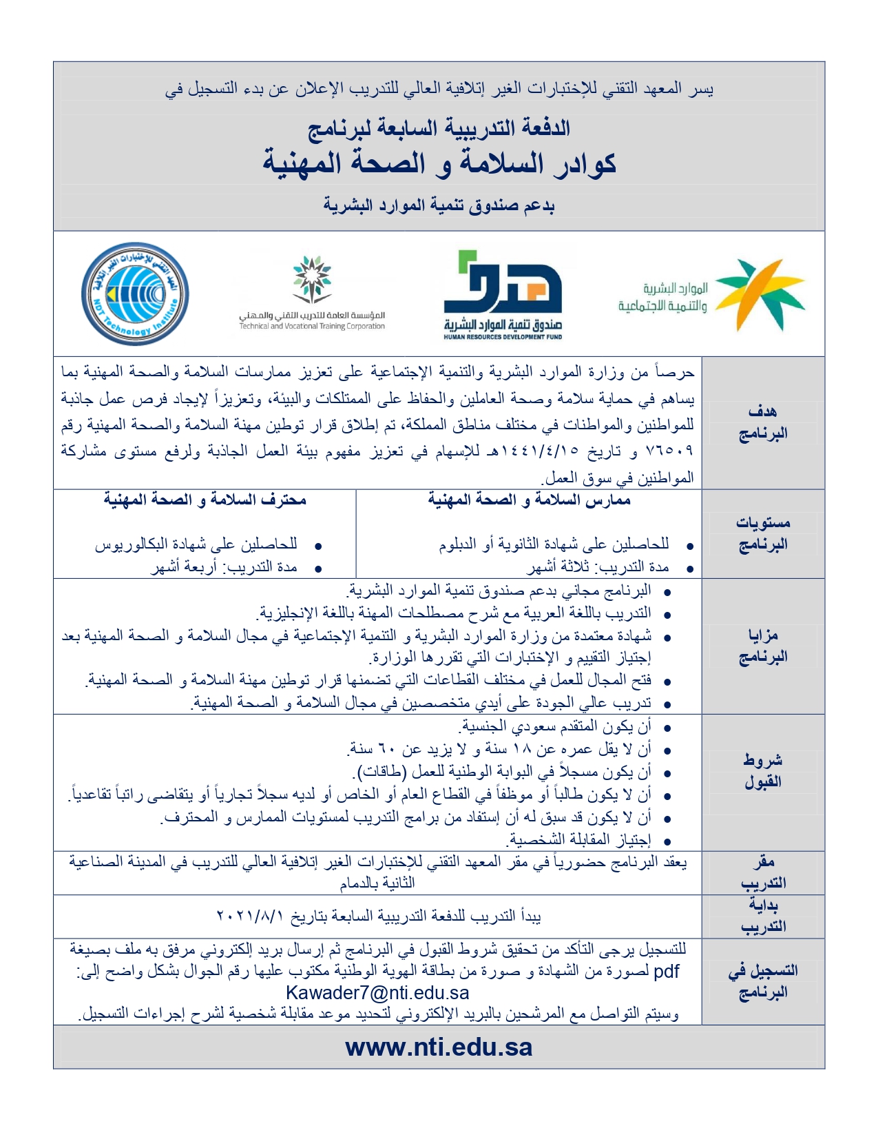 وزارة الموارد البشرية بالتعاون مع المعهد التقني للإختبارات الغير إتلافية تعلن عن إطلاق برنامج (كوادر السلامة والصحة المهنية - الدفعة التدريبية السابعة) وذلك ضمن مبادرات تطوير وتأهيل الخريجين في مجال الصحة والسلامة والمدعومة بالكامل من صندوق (هدف)، وذلك لتعزيز معرفة ومهارة الكوادر البشرية في مجال السلامة والصحة المهنية وتعزيز تطبيق ممارسات السلامة والصحة المهنية في المنشآت، وذلك وفقاً للتفاصيل التالية: