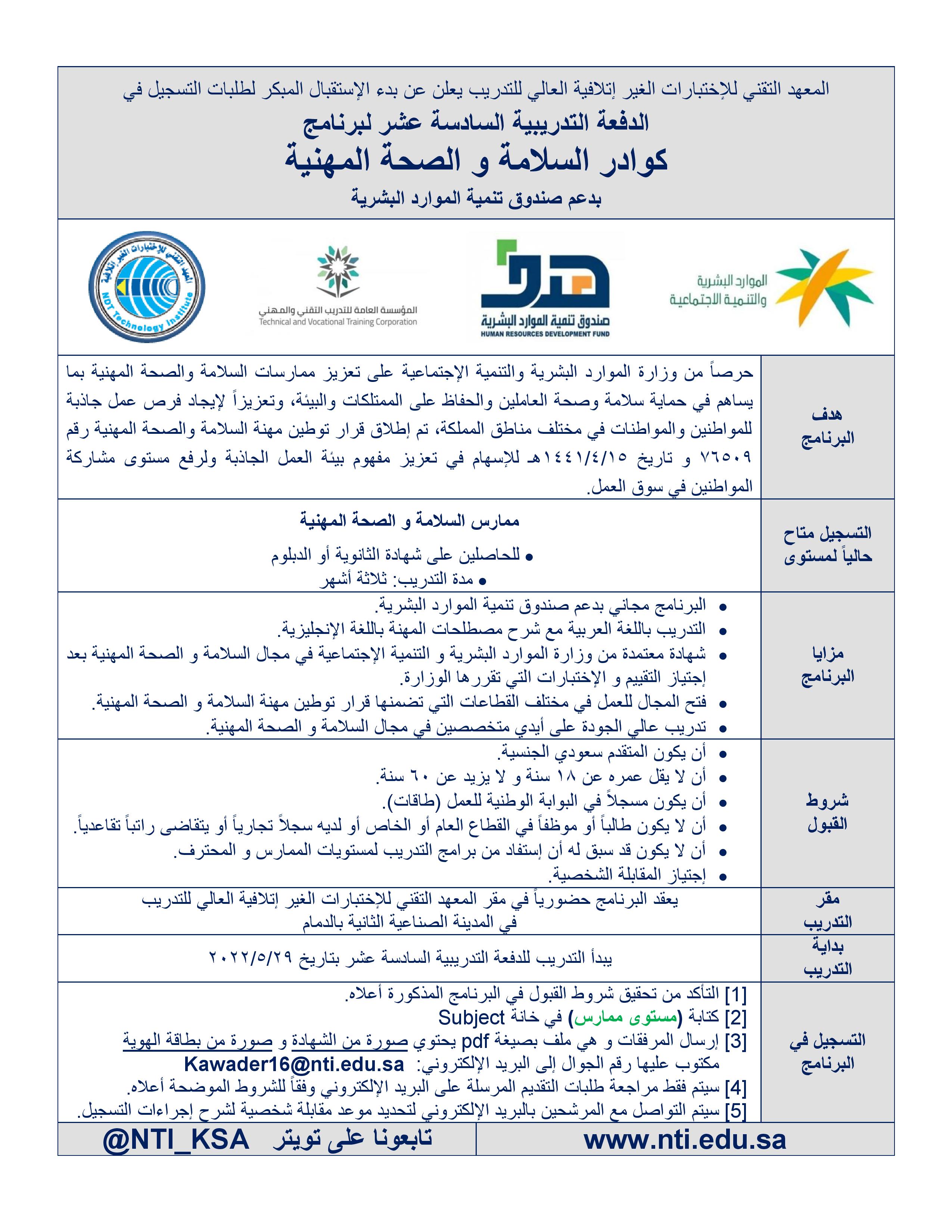 المعهد التقني للإختبارات الغير إتلافية بالتعاون مع وزارة الموارد البشرية يعلن عن إطلاق برنامج (كوادر السلامة والصحة المهنية - الدفعة التدريبية السادسة عشر) وذلك ضمن مبادرات تطوير وتأهيل الخريجين في مجال الصحة والسلامة والمدعومة بالكامل من صندوق (هدف)، وذلك لتعزيز معرفة ومهارة الكوادر البشرية في مجال السلامة والصحة المهنية وتعزيز تطبيق ممارسات السلامة والصحة المهنية في المنشآت، وذلك وفقاً للتفاصيل التالية: