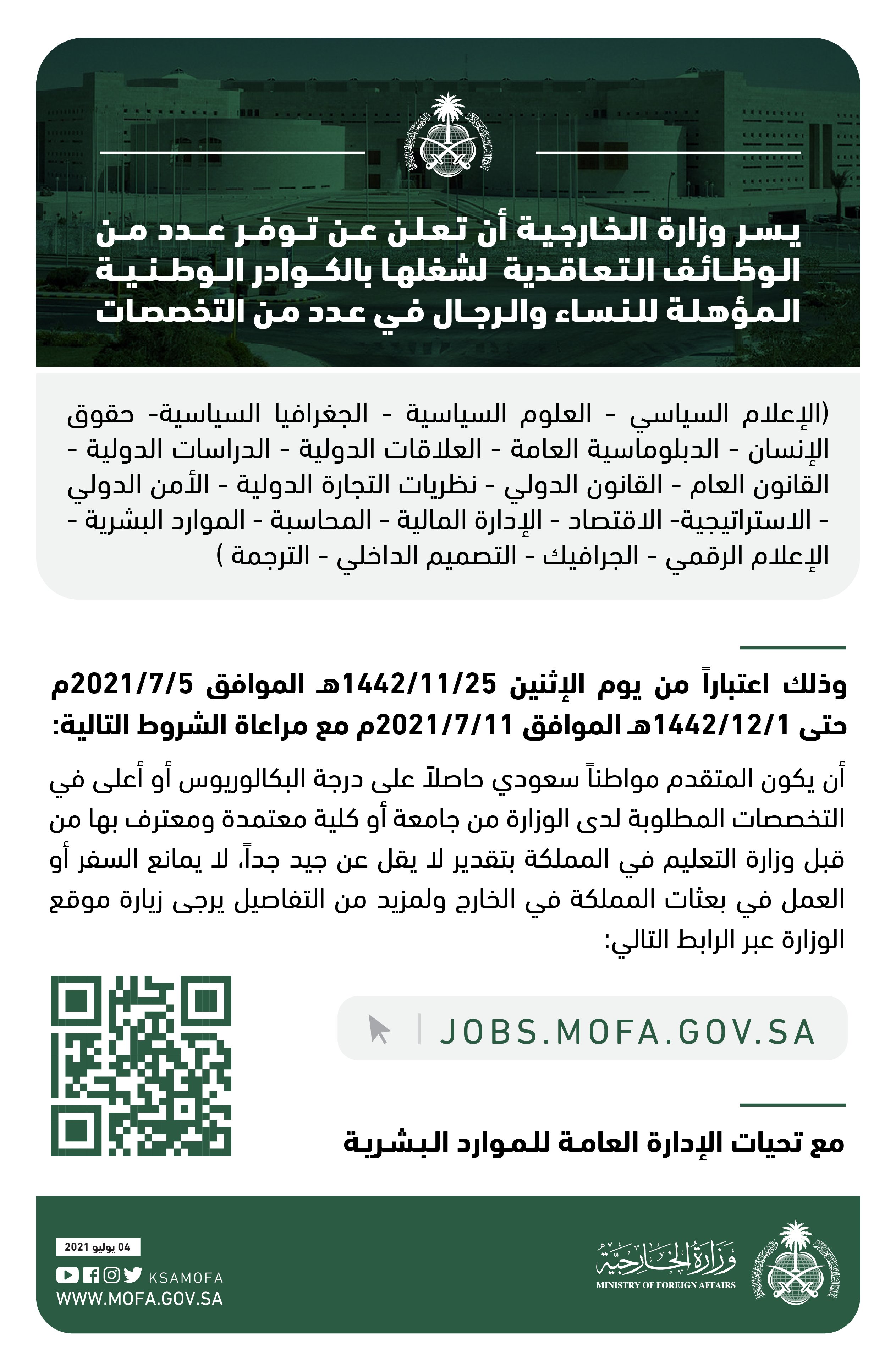 أعلنت وزارة الخارجية ممثلة في الإدارة العامة للموارد البشرية، فتح باب التوظيف لشغل عدد من الوظائف التعاقدية بالكوادر الوطنية المؤهلة (للرجال والنساء) في عدد من التخصصات، وذلك وفقاً للتفاصيل التالية: