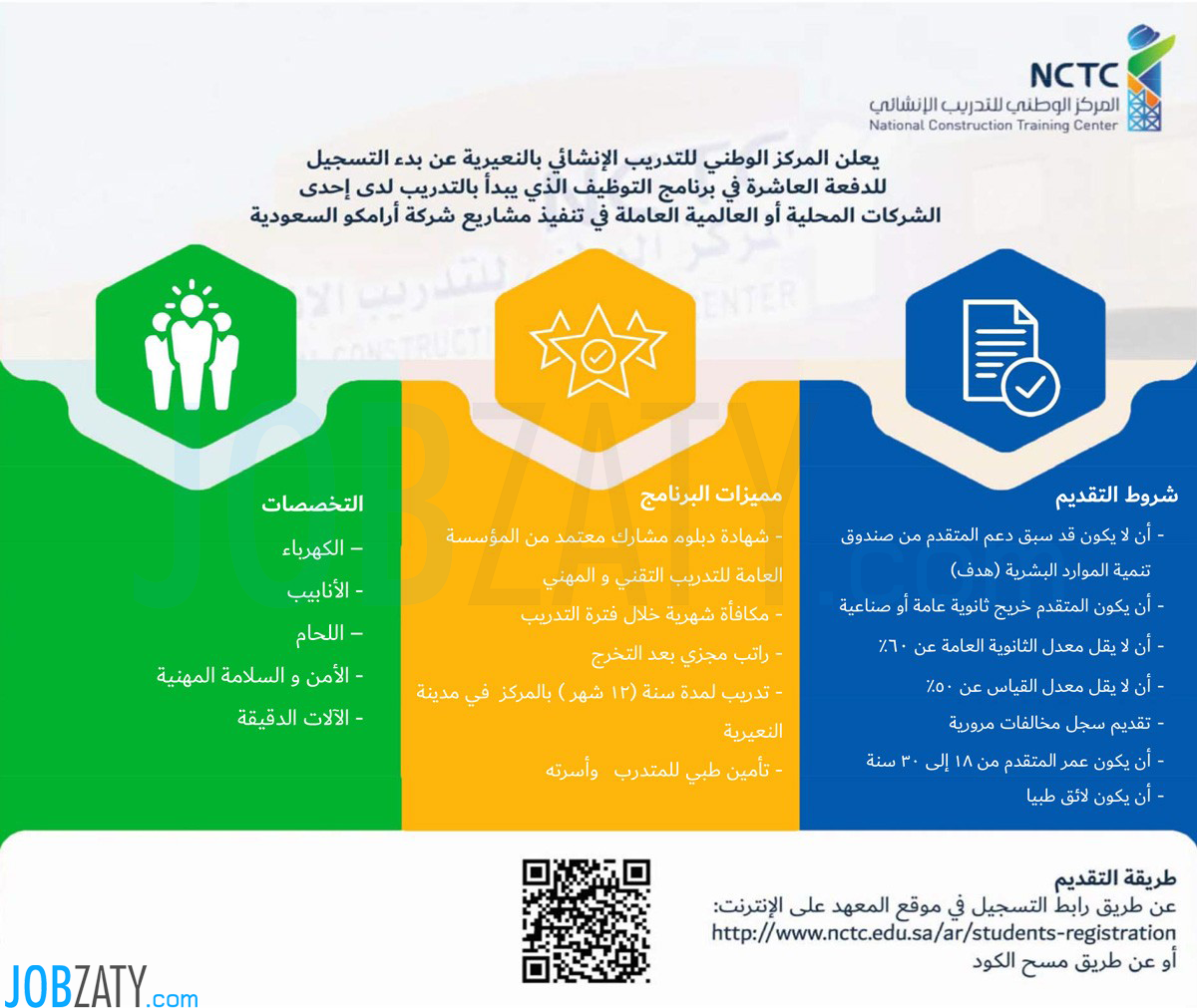 أعلن المركز الوطني للتدريب الإنشائي بدء التسجيل للدفعة العاشرة في برنامج التدريب والتوظيف الذي يبدأ بالتدريب لدى إحدى الشركات المحلية أو العالمية العاملة في تنفيذ مشاريع شركة أرامكو السعودية، وذلك وفقاً للتفاصيل التالية:
