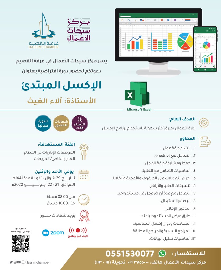 الغرفة التجارية الصناعية بالقصيم تعلن عن تقديم دورة مجانية (عن بعد) للرجال والنساء، لشرح برنامج الإكسل بدء من المستوى المبتديء، مع منح المتدربين شهادات حضور، وذلك وفقا للتفاصيل التالية: