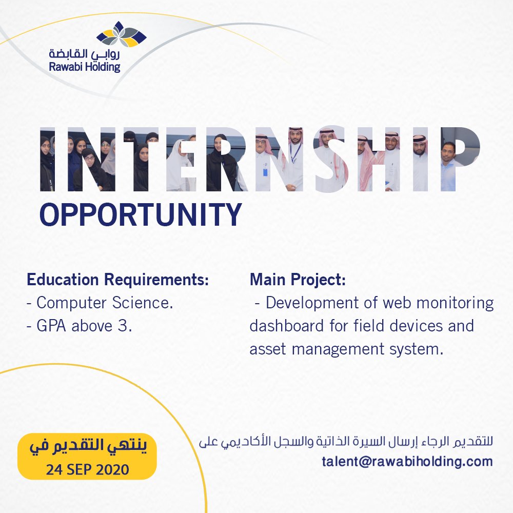 أعلنت شركة روابي القابضة عن بدء التقديم في البرنامج التدريبي التقني لعام 2020م، والذي يستهدف الطلاب والطالبات وحديثي التخرج في التخصصات التقنية/الحاسب، وذلك وفقاً للتفاصيل والشروط التالية: