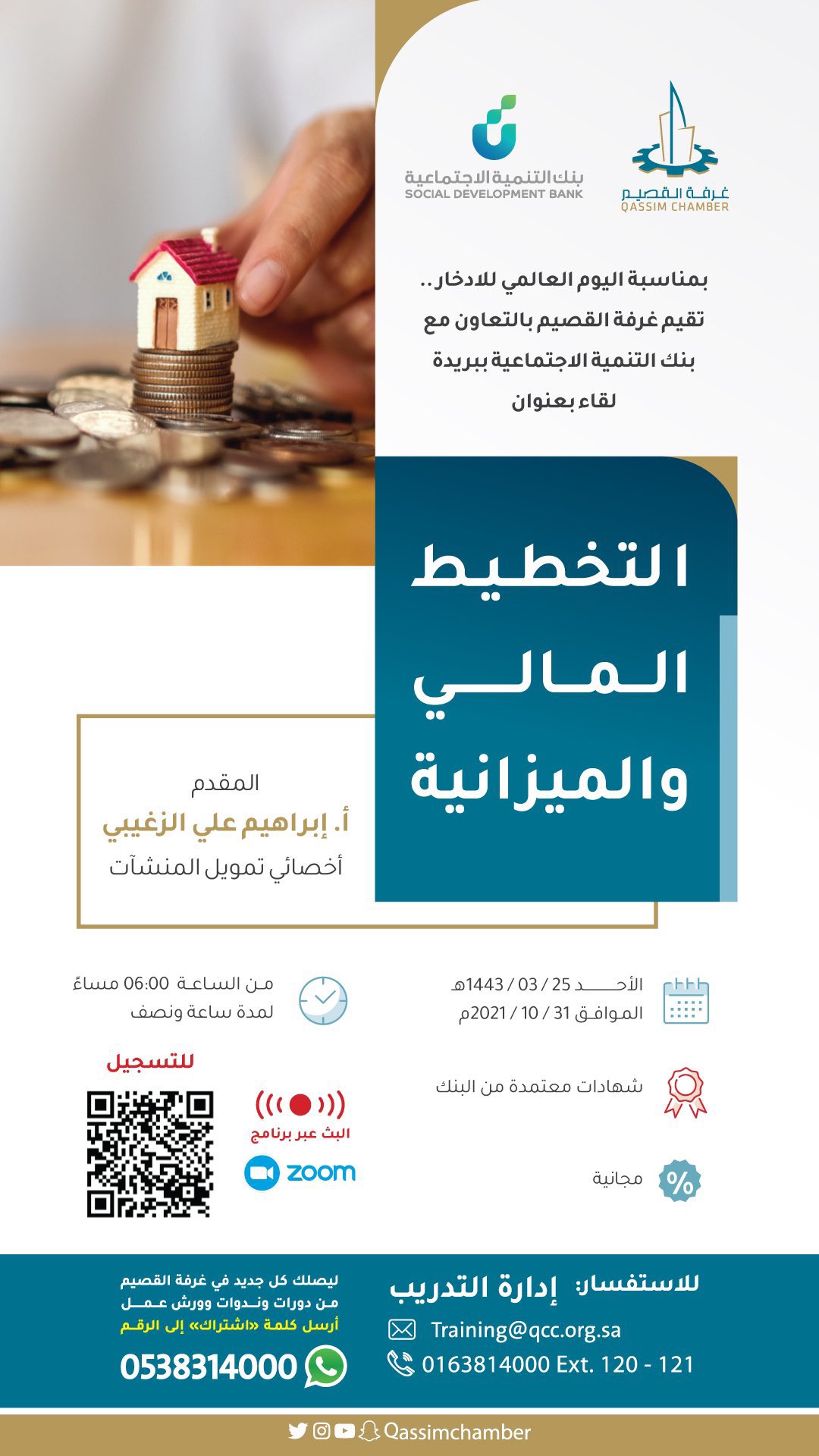 أعلن بنك التنمية الاجتماعية؛ بالتعاون مع غرفة القصيم عن تقديم دورة تدريبية مجانية (عن بعد) في مجال التخطيط المالي و الميزانية، تستهدف الدورات كافة فئات المجتمع من الرجال والنساء، مع منح المتدربين شهادات حضور معتمدة من البنك، وفقاً للتفاصيل التالية: