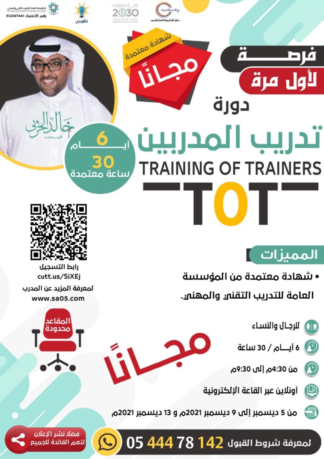 أعلان دورة تدريبية (مجانية) بعنوان (تدريب المدربين ToT) والتي تُقام (عن بعد)، وتستهدف كافة فئات المجتمع من الرجال والنساء لمدة (6) أيام (30 ساعة معتمدة)، مع منح المتدربين شهادات معتمدة من المؤسسة العامة للتدريب التقني والمهني، وفقاً للتفاصيل التالية: