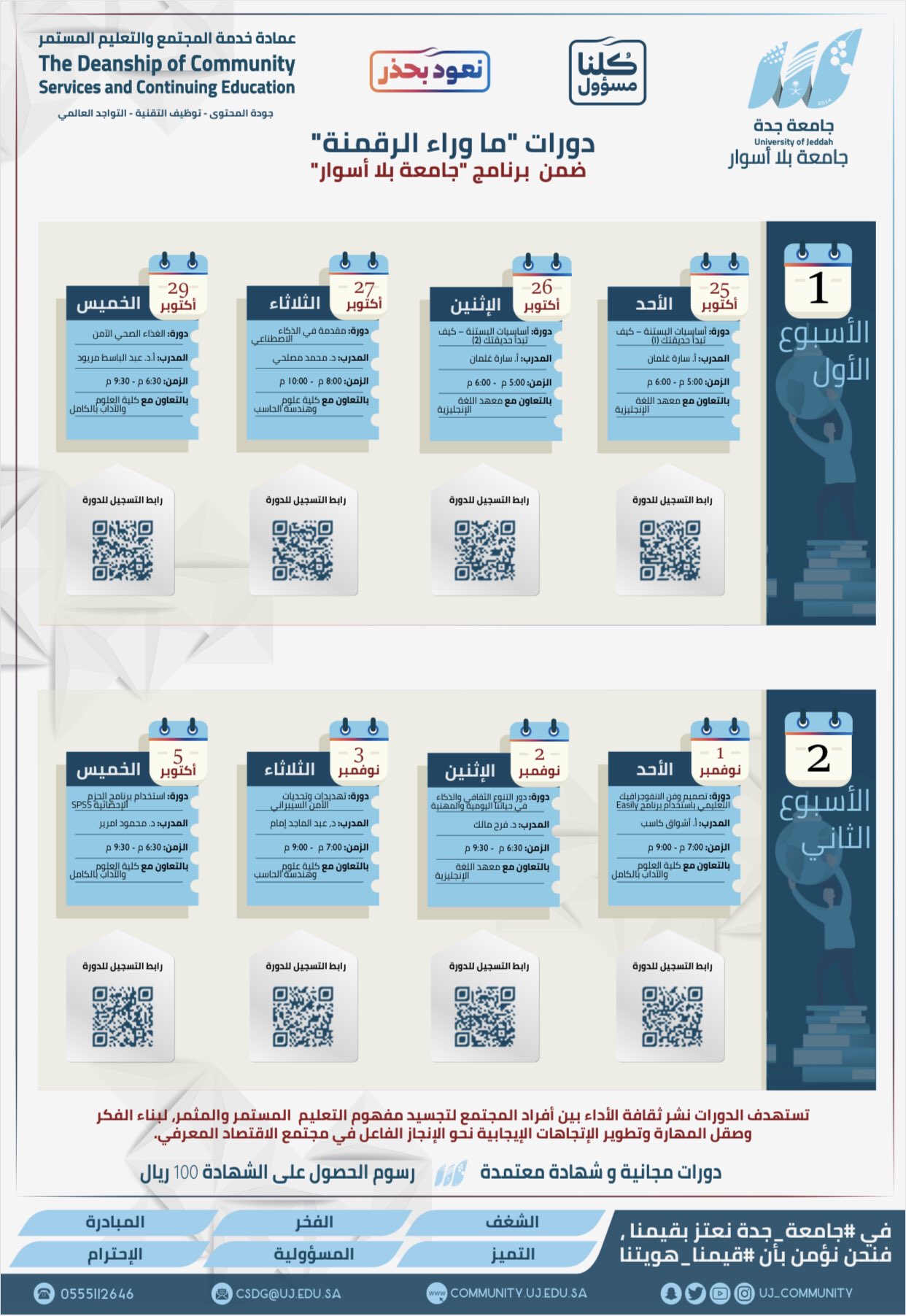 أعلنت جامعة جدة ممثلة في عمادة خدمة المجتمع والتعليم المستمر عن تقديم دورات مجانية بعنوان "ما وراء الرقمنة" ضمن برنامج جامعة بلا أسوار أحد برامج رؤية الجامعة السعودية الحديثة، تستهدف الدورات كافة فئات المجتمع لنشر ثقافة الأداء بين أفراد المجتمع لتجسيد مفهوم التعليم المستمر والمثمر، لبناء الفكر وصقل المهارة وتطوير الإتجاهات الإيجابية نحو الإنجاز الفاعل في مجمع الاقتصاد المعرفي، وذلك وفقاً للتفاصيل التالية: