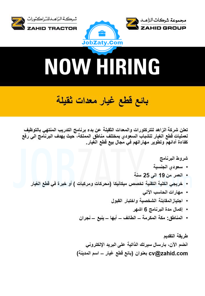 مجموعة شركات الزاهد (الزاهد للتركتورات والمعدات الثقيلة) تعلن عن بدء التقديم في برنامج (التدريب المنتهي بالتوظيف 2021م) لعمليات قطع الغيار؛ للشباب السعودي بمختلف مناطق المملكة، حيث يهدف البرنامج إلى رفع كفاءة أدائهم وتطویر مهاراتهم في مجال بيع قطع الغيار - وفقاً للتفاصيل التالية: