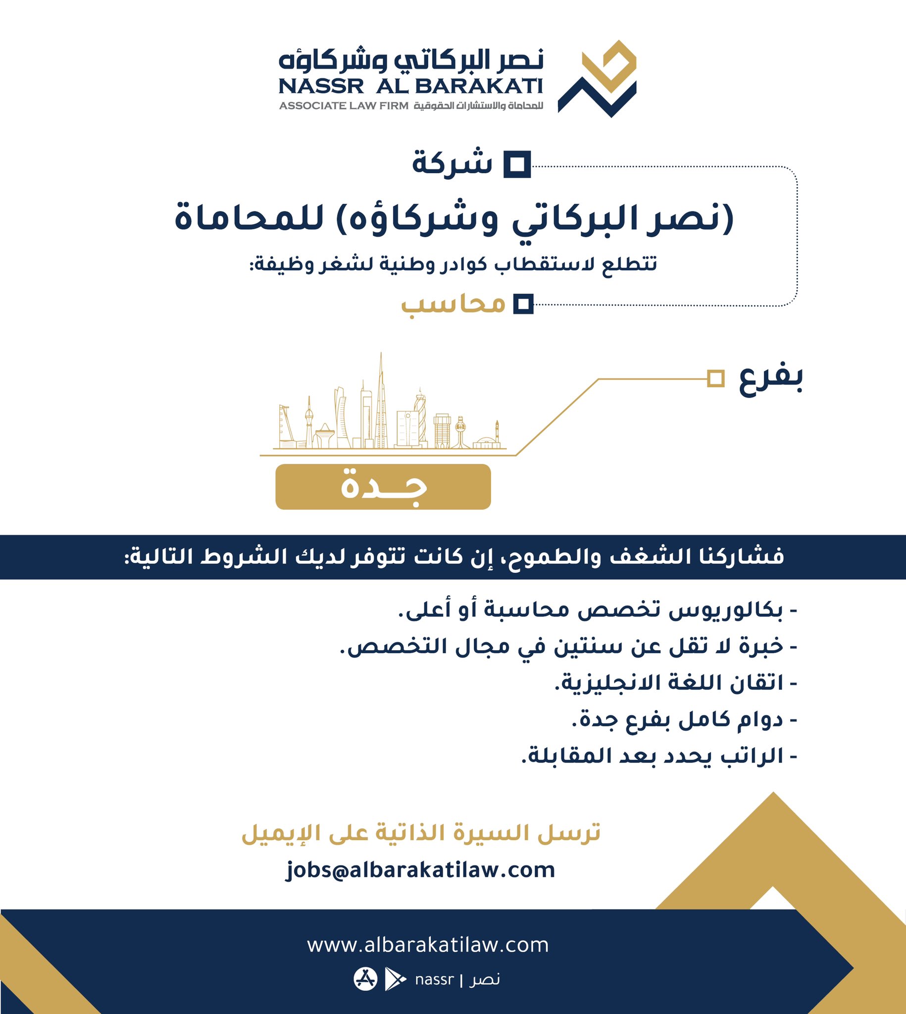 توفر وظائف شاغرة لحملة البكالوريوس فما فوق للعمل بمجال المحاسبة - بفرع الشركة بمدية جدة - وفقاً للتفاصيل التالية: