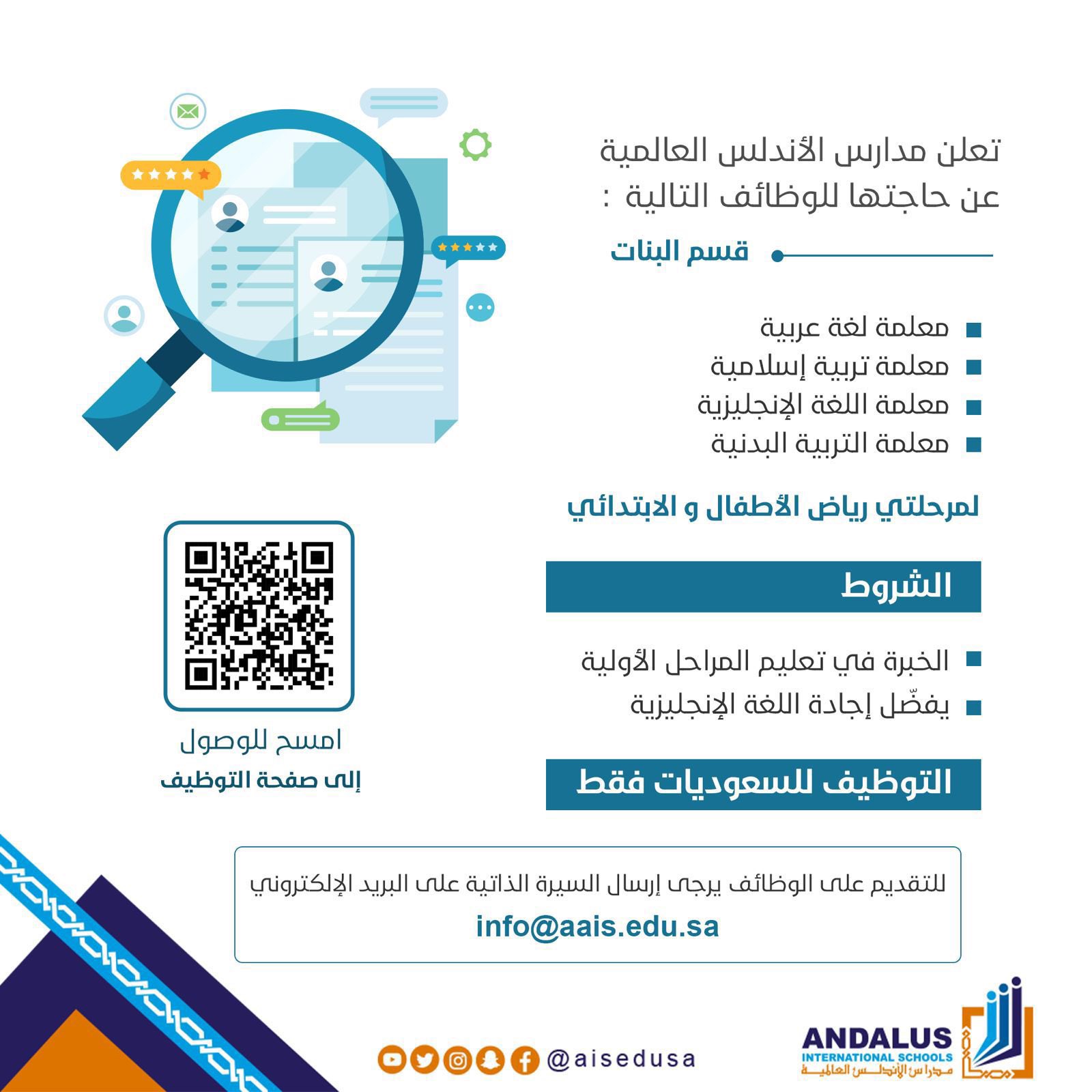 توفر وظائف تعليمية شاغرة في عدة تخصصات (لمرحلتي رياض الأطفال والإبتدائي) للعمل بمدارسها في مدينة جدة - مع ملاحظة أن التقديم متاح للسعوديين، وفقاً للتفاصيل التالية: