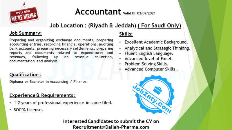 توفر وظيفة شاغرة للعمل لحملة الدبلوم، البكالوريوس للعمل بمجال المحاسبة بكلاً من: الرياض، جدة، مع ملاحظة أن التقديم متاح للسعوديين فقط، وذلك وفقاً للتفاصيل التالية:
