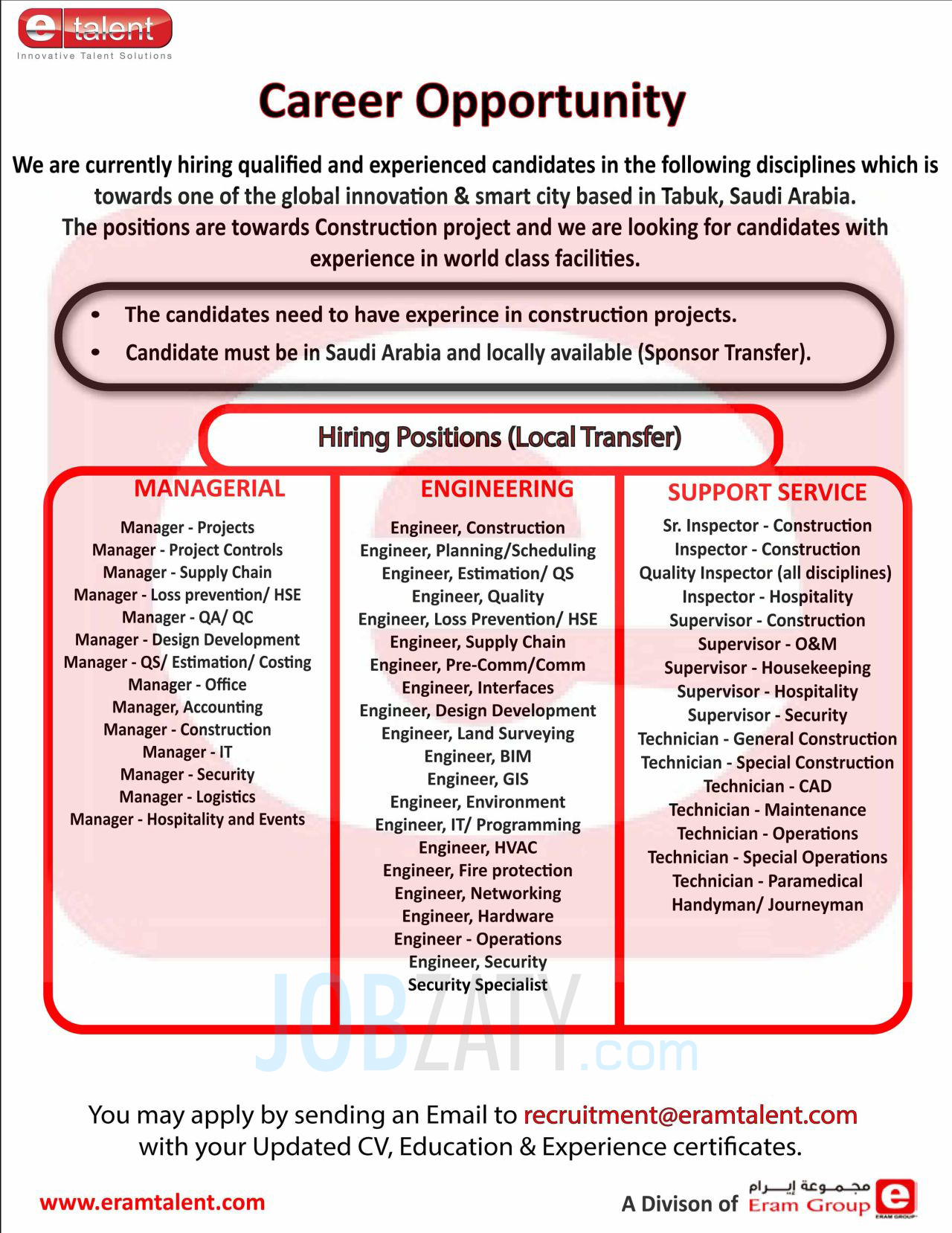 تعلن طرح وظائف شاغرة في عدة تخصصات: (إدارية، هندسية، تقنية، فنية) للعمل ضمن أحد أكبر مشاريع المدن الذكية والإبتكارات العالمية في العالم بمدينة تبوك، مع ملاحظة أن أفضلية التقديم للسعوديين، وذلك وفقاً للتفاصيل والمسميات التالية: