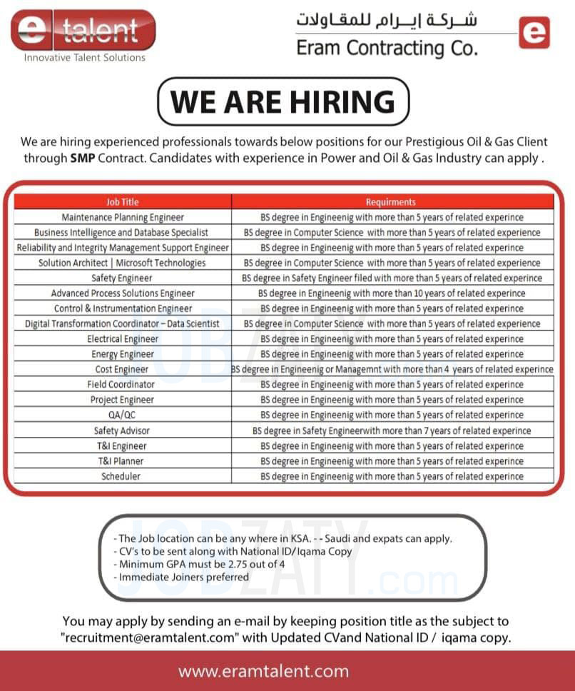 توفر وظائف هندسية وتقنية شاغرة لحملة البكالوريوس فما فوق للعمل بكبرى مشاريع النفط والغاز بنظام عقود (SMP) ، مع ملاحظة أن (أفضلية) التقديم للسعوديين، وفقاً للتفاصيل التالية: