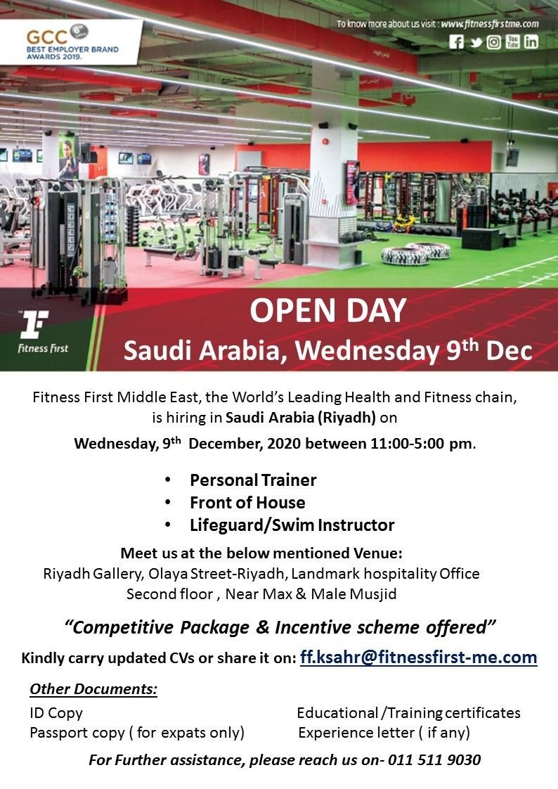 سلسلة أندية فيتنس فيرست تعلن إقامة يوم التوظيف المفتوح طرح شواغر وظيفية للعمل بفروع النادي في المملكة العربية السعودية (الرياض)؛ مع ملاحظة أن أفضلية التوظيف ستكون للسعوديين، وذلك وفقاً للتفاصيل والمسميات التالية: