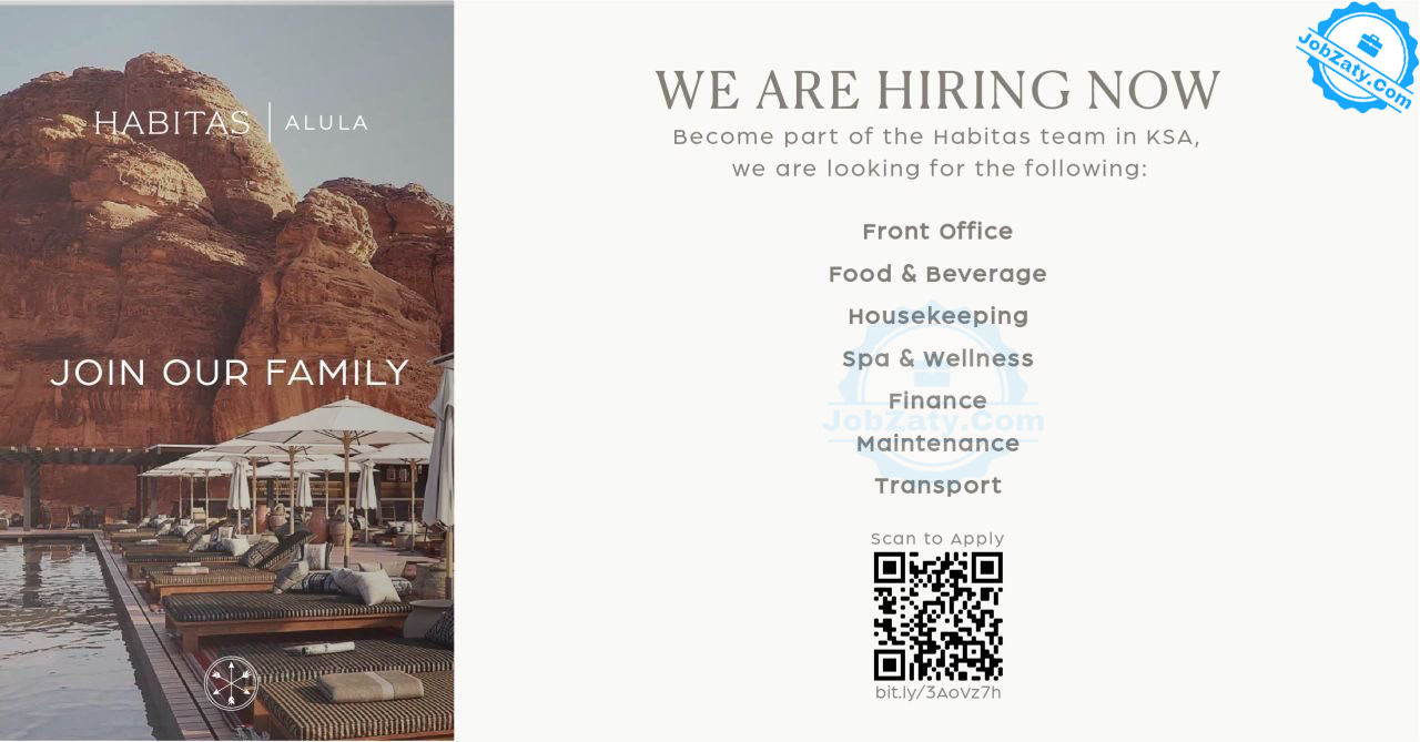 منتجع هابيتاس العلا (HABITAS)، يعلن فتح باب التوظيف لحملة مختلف المؤهلات للعمل بعدة مجالات في العلا - وفقاً للتفاصيل التالية: