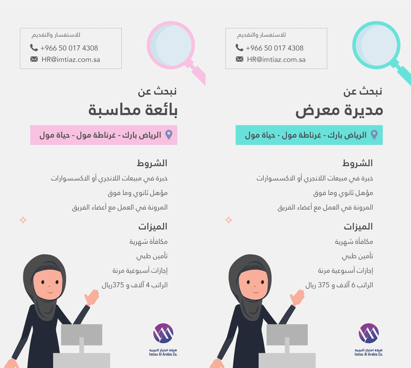 توفر وظائف نسائية شاغرة لحملة الثانوية فما فوق للعمل بمجال المبيعات بكلاً من: (الرياض بارك، غرناطة مول، حياة مول)، مع ملاحظة أن التقديم متاح للسعوديين فقط، وفقاً للتفاصيل التالية: