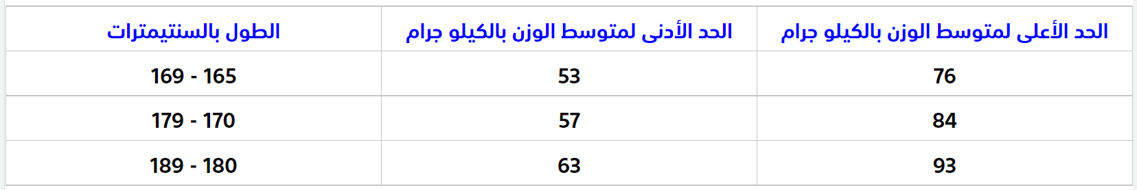 أن يكون الطول والوزن متوافقا مع الجدول التالي ( اضغط هـنـا ).