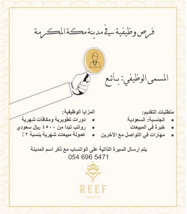 توفر وظائف شاغرة لحملة الثانوية فأعلى للعمل بمجال مبيعات العطور بمدينة مكة المكرمة - مع ملاحظة أن التقديم متاح للسعوديين فقط، وفقاً للتفاصيل التالية: