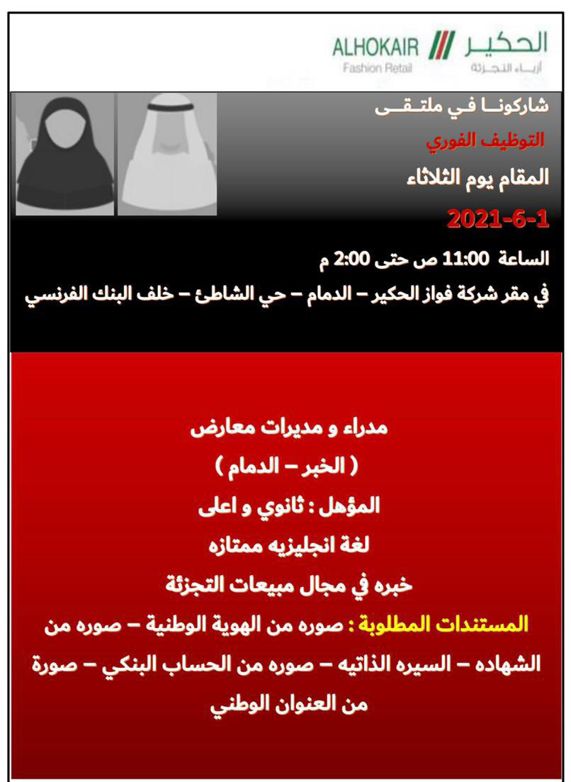 تعلن إقامة ملتقى التوظيف الفوري، لحملة الثانوية فما فوق (رجال / نساء) للعمل بمجال المبيعات - بفروع الشركة في كلاً من: (الدمام، الخبر)، مع ملاحظة أن التقديم متاح للسعوديين فقط، وذلك وفقاً للتفاصيل التالية: