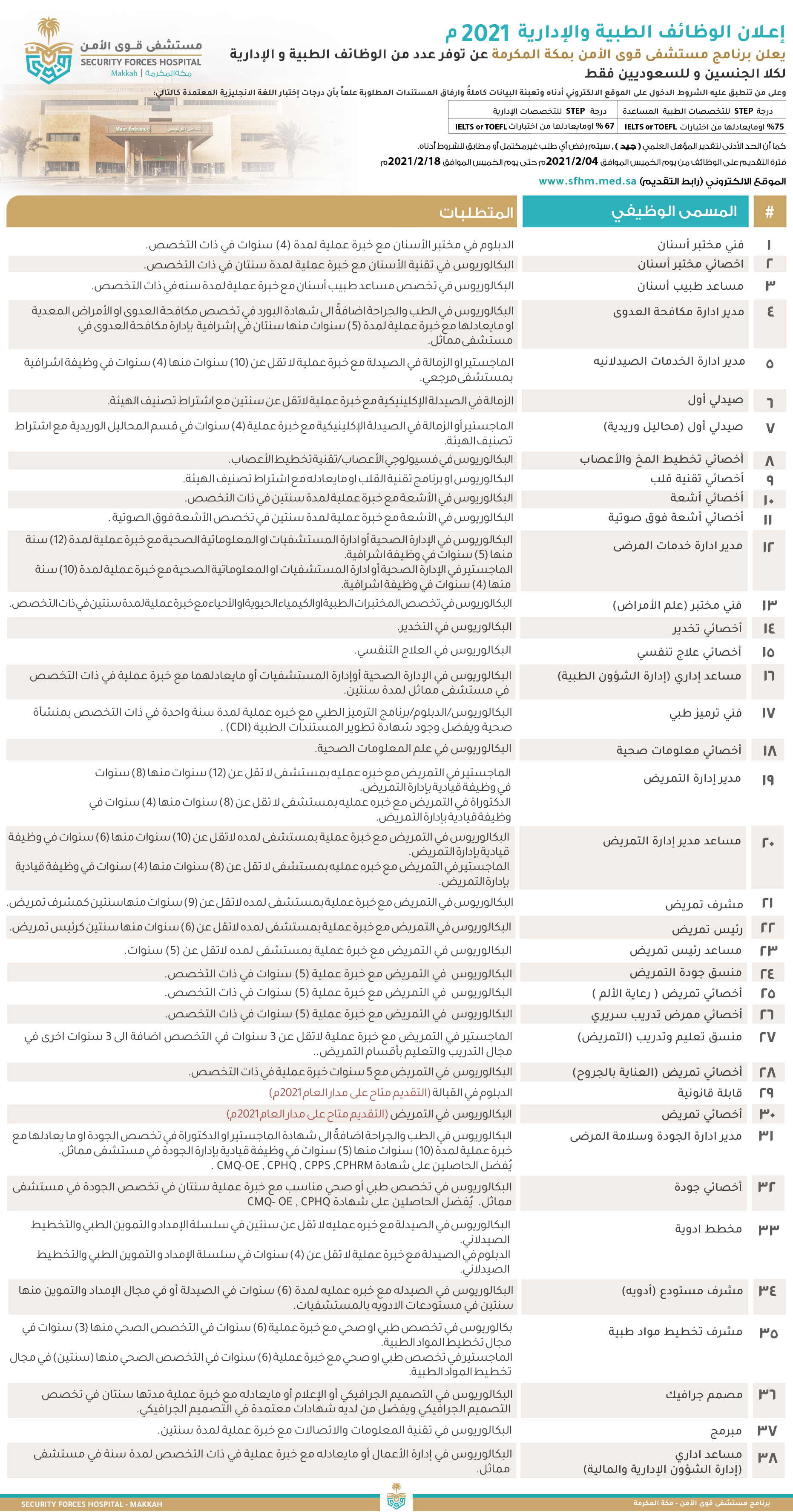 يعلن فتح باب التوظيف لحملة (الدبلوم، البكالوريوس، الماجستير) في عدة تخصصات صحية وطبية وإدارية، مع ملاحظة أن التقديم متاح للسعوديين فقط، وفقاً للتفاصيل التالية: