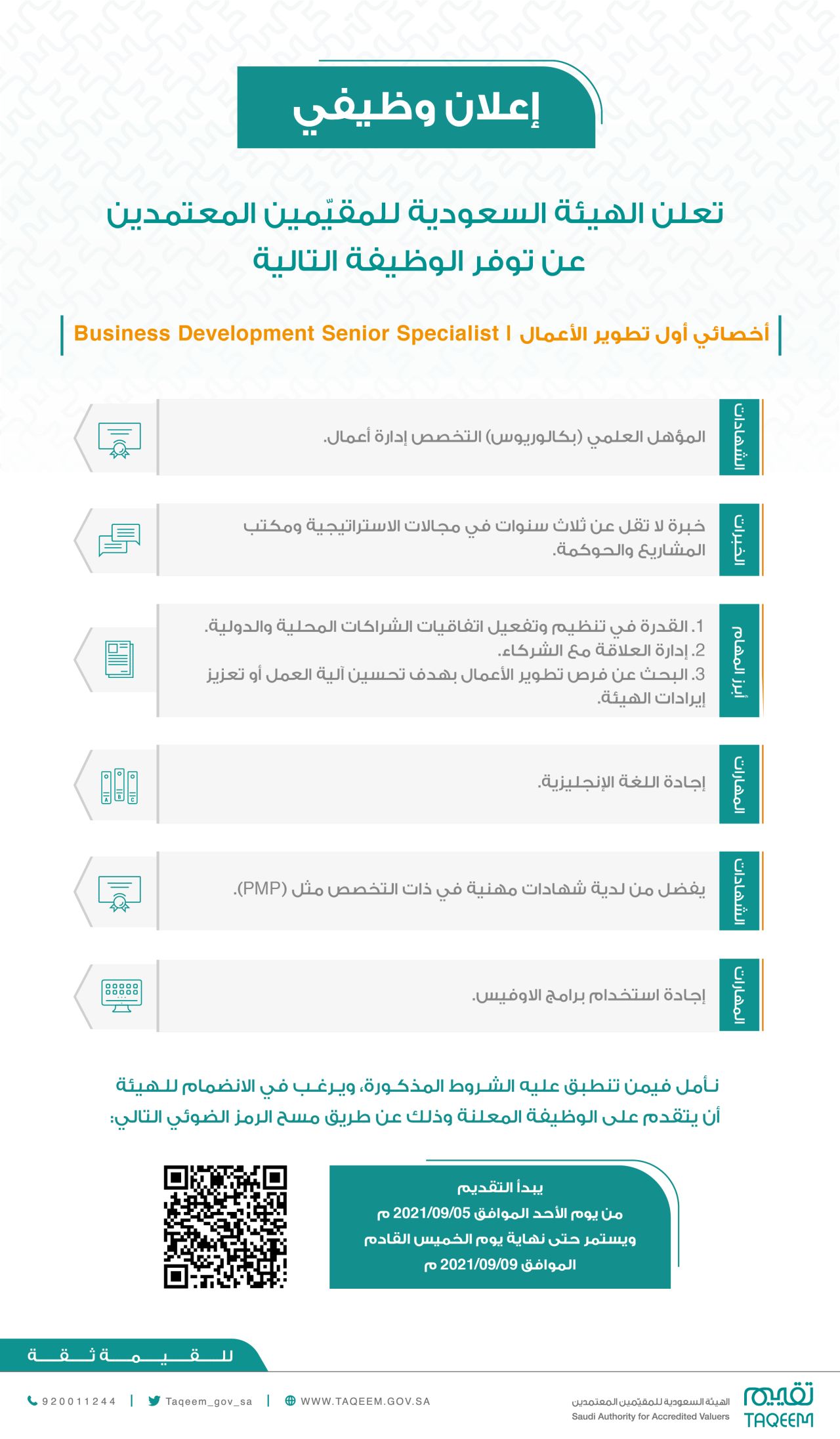 توفر وظائف إدارية شاغرة لحملة البكالوريوس، للعمل بمجال تطوير الأعمال؛ بالمقر الرئيسي بمدينة الرياض - مع ملاحظة أن التقديم متاح للسعوديين فقط، وفقاً للتفاصيل التالية: