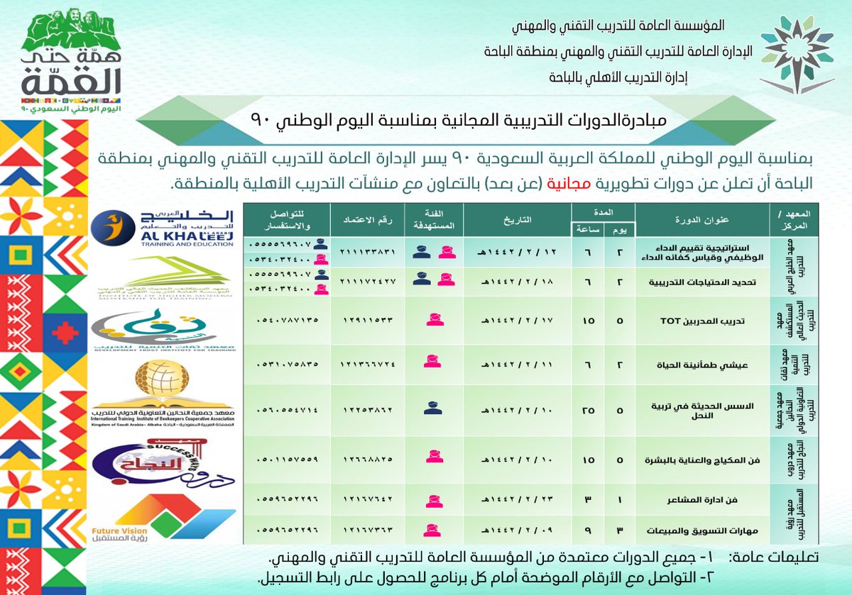 - للإطلاع على مواعيد الدورات والتسجيل (بالتواصل مع الأرقام الموضحة أمام الدورات):