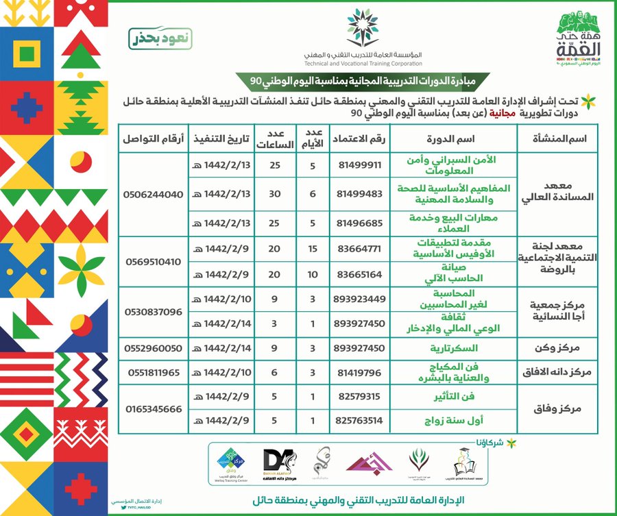 الإدارة العامة للتدريب التقني والمهني تعلن عن تقديم (27) دورة مجانية، وذلك ضمن مبادرة الدورات التطويرية المجانية بالتعاون مع المنشآت التدريبة الأهلية بمناسبة (اليوم الوطني السعودي 90)، تستهدف الدورات كافة فئات المجتمع من الرجال والنساء، مع منح المتدربين شهادات معتمدة من إدارة التدريب التقني، وفقاً للتفاصيل التالية: