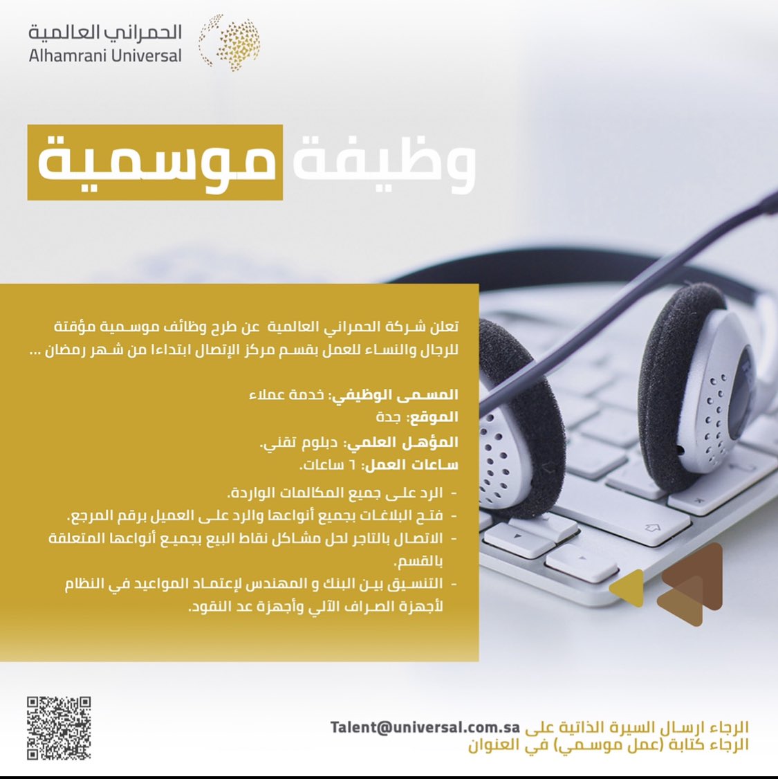 تعلن فتح باب التوظيف الموسمي لحملة (الدبلوم - للجنسين) للعمل بقسم مركز الإتصال ابتداءا من شهر رمضان، بفروع الشركة بمحافظة جدة - مع ملاحظة أن التقديم متاح للسعوديين فقط، وفقاً للتفاصيل التالية: