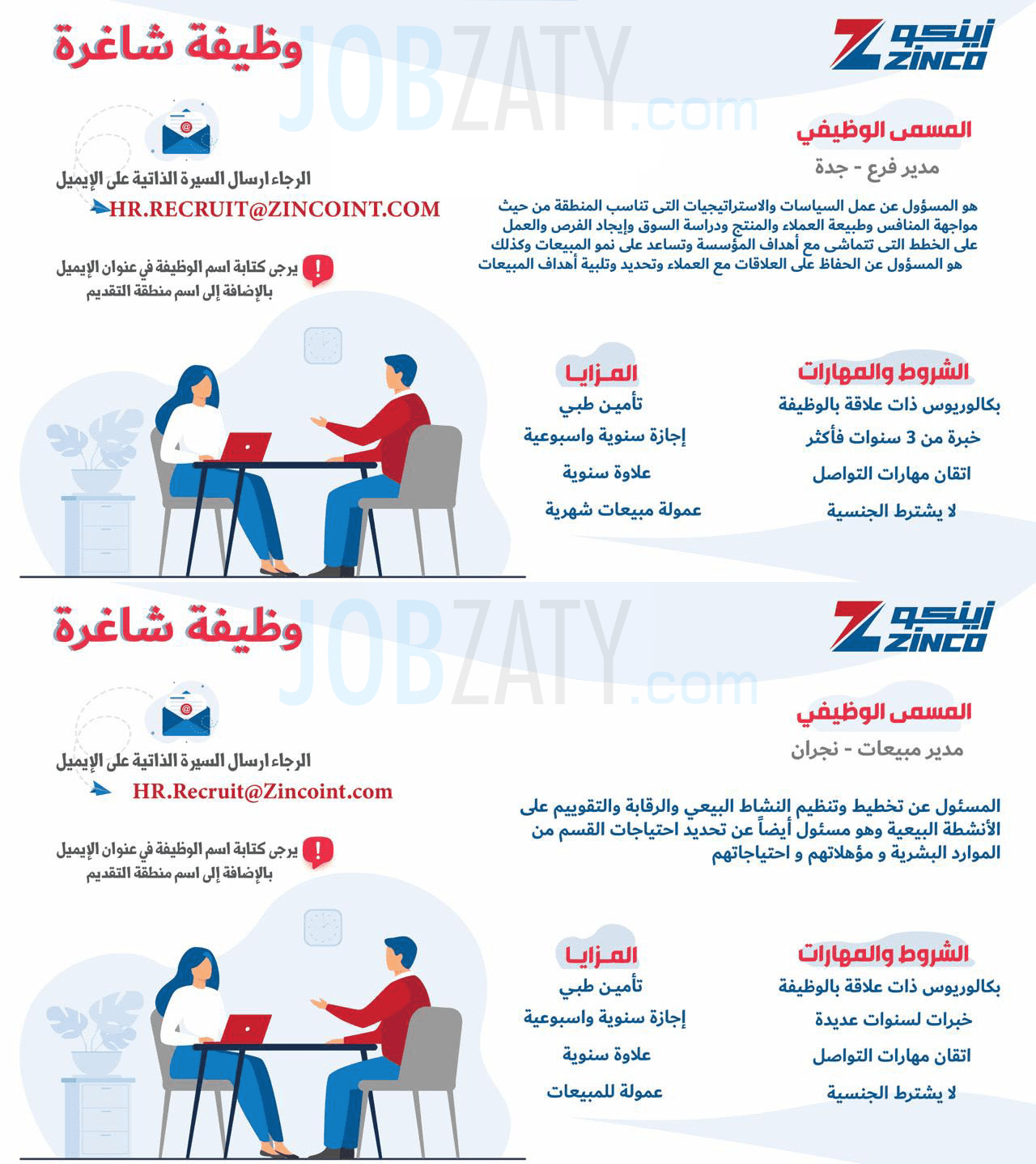 - تُرسل السيرة الذاتية على الإيميل التالي مع كتابة المسمى الوظيفي والمنطقة في حقل العنوان.